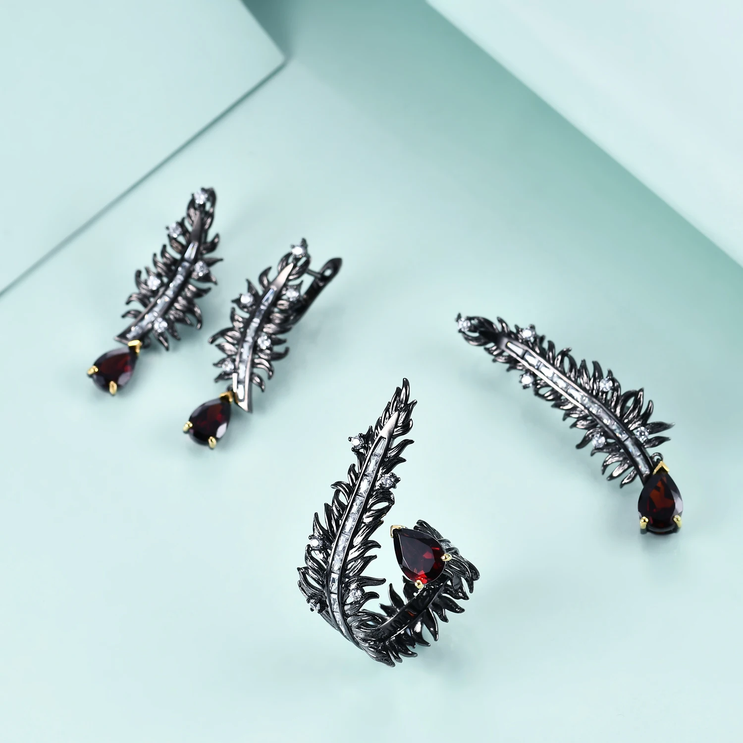 Женское кольцо из серебра 925 пробы с перьями и гранатом