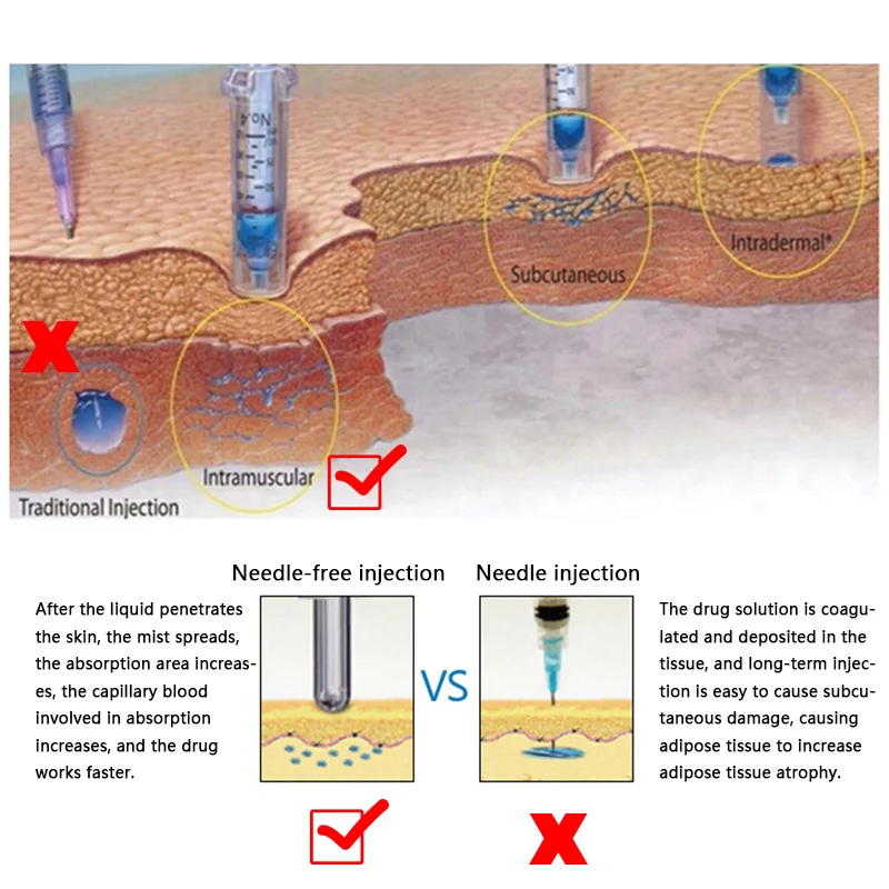 1. Без иглы:У многих людей игольчатая фобия. Наша технология без игл облегчает игольную фобию без игл.2. Практически без боли:Быстрая инъекция менее 1/3 секунды, микро отверстие и автоматическое пружинное давление делают инъекции с «серой» практически безболезненными3. Быстро, легко и безопасно:Он может быть использован пациентами для самостоятельной инъекции, или другие лица могут вводить инъекции назначенного лекарства.4. Нет риска травм игольчатой палки:Он устраняет повреждения игольчатой палки, так же как и без игл, тем самым снижая затраты на удаление, устраняет перекрестное загрязнение5. Сопло и адаптер стерилизуются гамма-облучением:Они одноразовые, что исключает возможность перекрестного загрязнения.6. Длительный срок службы и низкое техническое обслуживание:Используется для более чем 10000 инъекций, и Он управляется самоприводной пружиной.