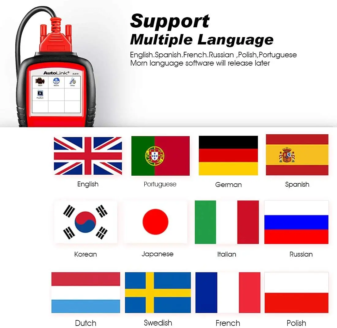 1. Мы являемся авторизованным дистрибьютором бренда Autel, 100% Новый оригинал Autel с обновлением программного обеспечения и гарантией. Если нет, то будет предоставлена двойная компенсация!2. Autel Autolink AL619 поддерживает несколько языков: английский, французский, испанский, немецкий, голландский, шведский, польский, корейский, японский, итальянский. (Пожалуйста, оставьте S/N машины для авторизации языка, который вы хотите после получения.)