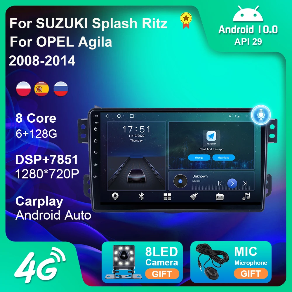 Автомобильное радио, стерео, 6 + 128G, Android 10, для Opel Agila, SUZUKI Splash Ritz 2008-2014, GPS-навигатор, Android, 4G, Wi-Fi, Carplay, DVD-плеер