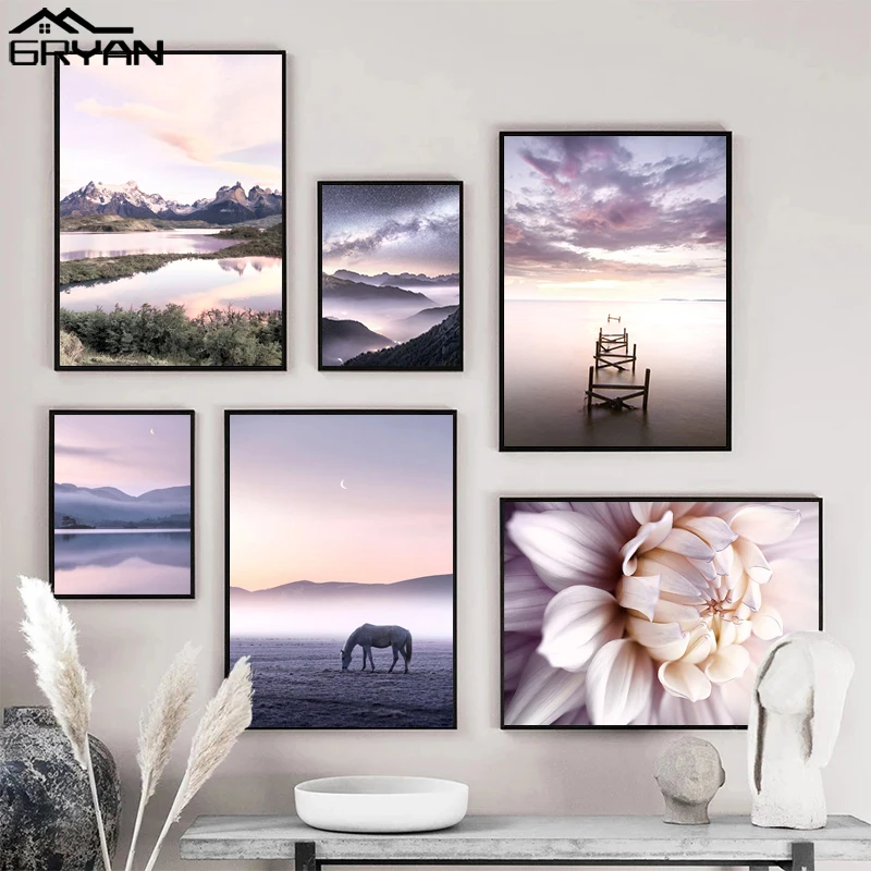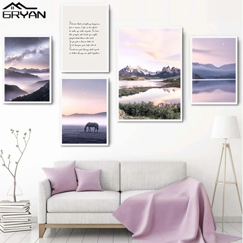 Фиолетовая Скандинавская Озерная Гора Небо лошадь морской пейзаж холст плакат Цветущий цветок Настенная картина рисунок туманная утренняя картина
