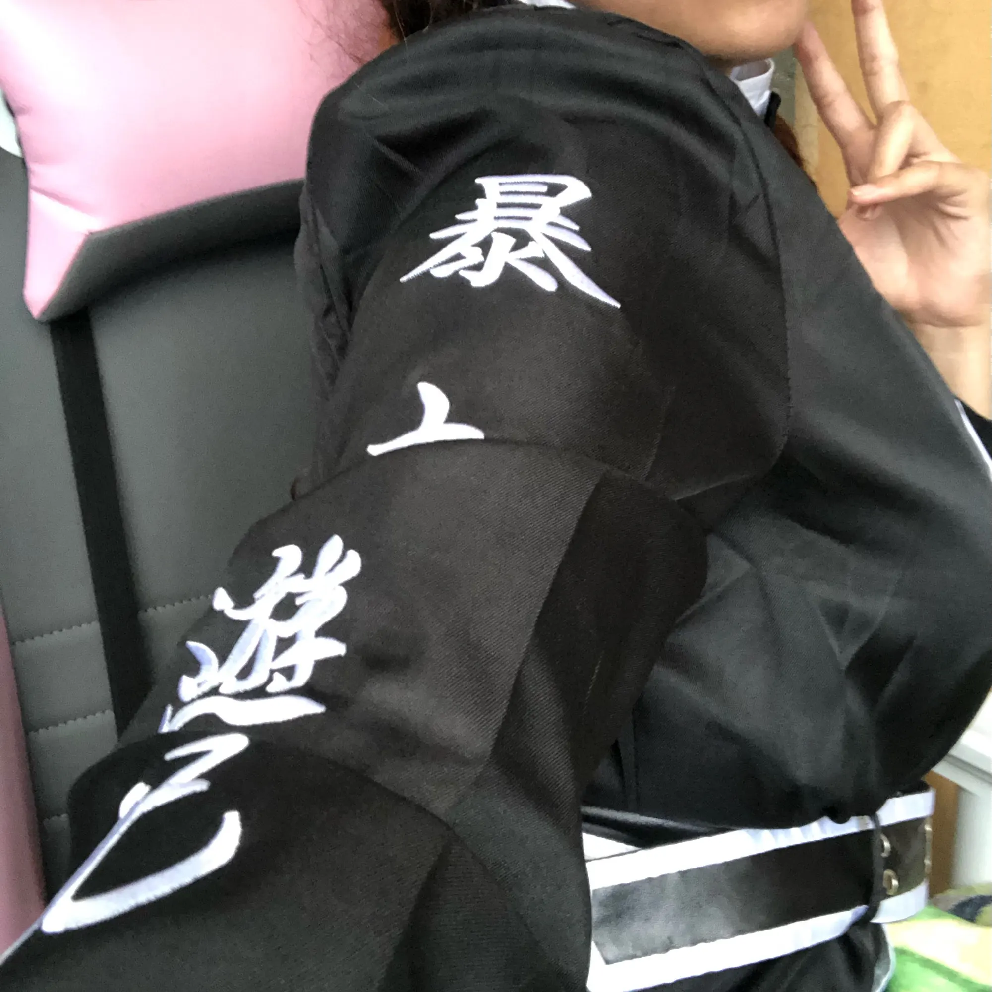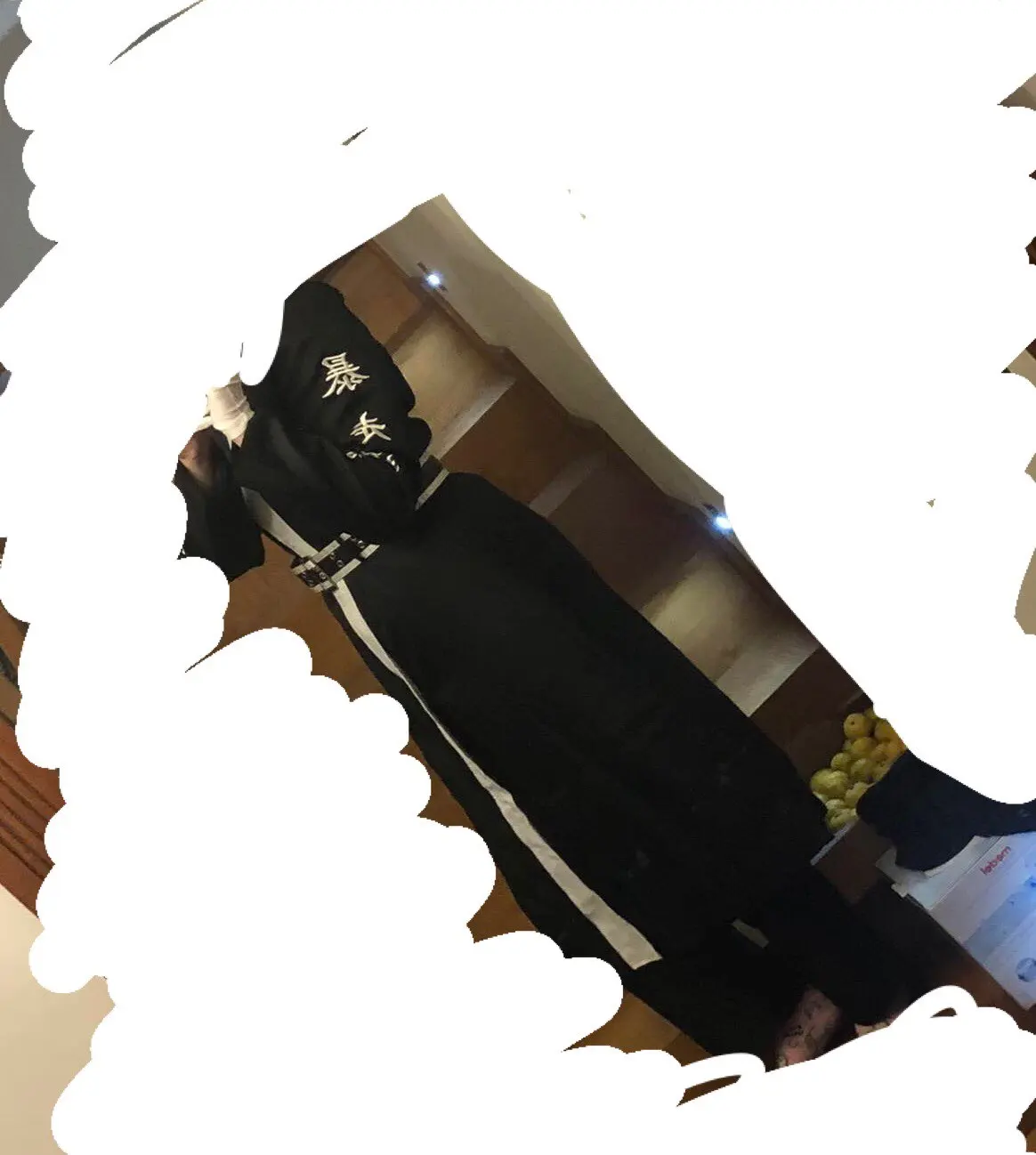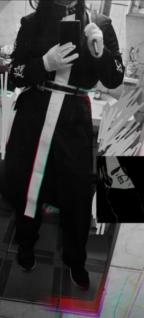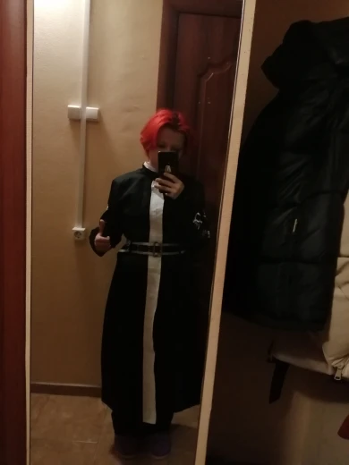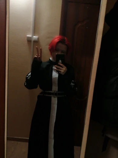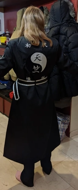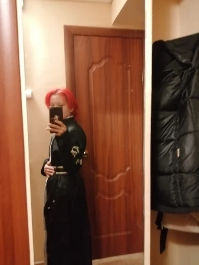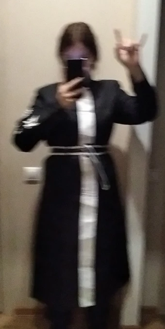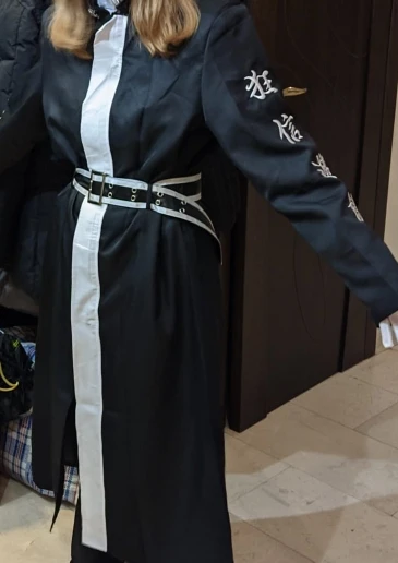 качество так себе, синтетика. радует, что есть подкладка и подпоечники. размер S оказался слегка большеват ( придется ушивать видимо) молния не до конца, а где-то до середины, чтобы удобно было ходить. ремень из какой-то дешманской кожи. сверху где шея ремешок продевается через мтеллическуб штуку и лепится на липучку. мой рост ± 155 (и сама я маленькая) штаны на резинке, оказались длинными, широко сесть в них вполне можно. перчатки хорошенькие. в подарок положили брошь- черепушку. заказывал 11.11, пришло 21.11 в постомат (Москва) кандзи - вышивка. больше фото мне стало лень делать, тут в принципе достаточно отзывов. из-за того что синтетика, поблескивает. удобно, что можно надеть теплую кофту под низ и будет не холодно. не помню, была ли тут размерная сетка. мои, насколько я помню это обхват бедер почти 90, талия ~ 54, грудь где-то 80 с чем-то вроде