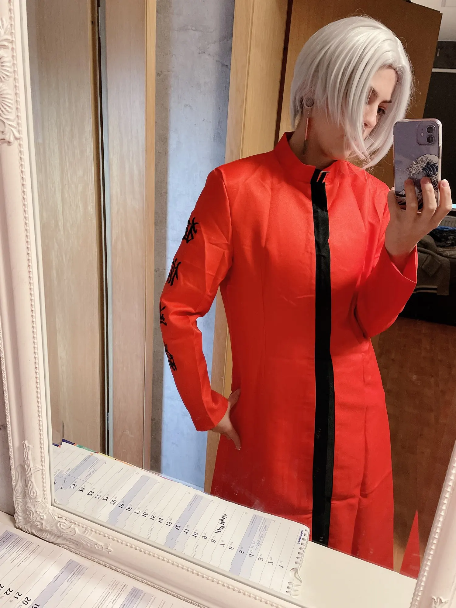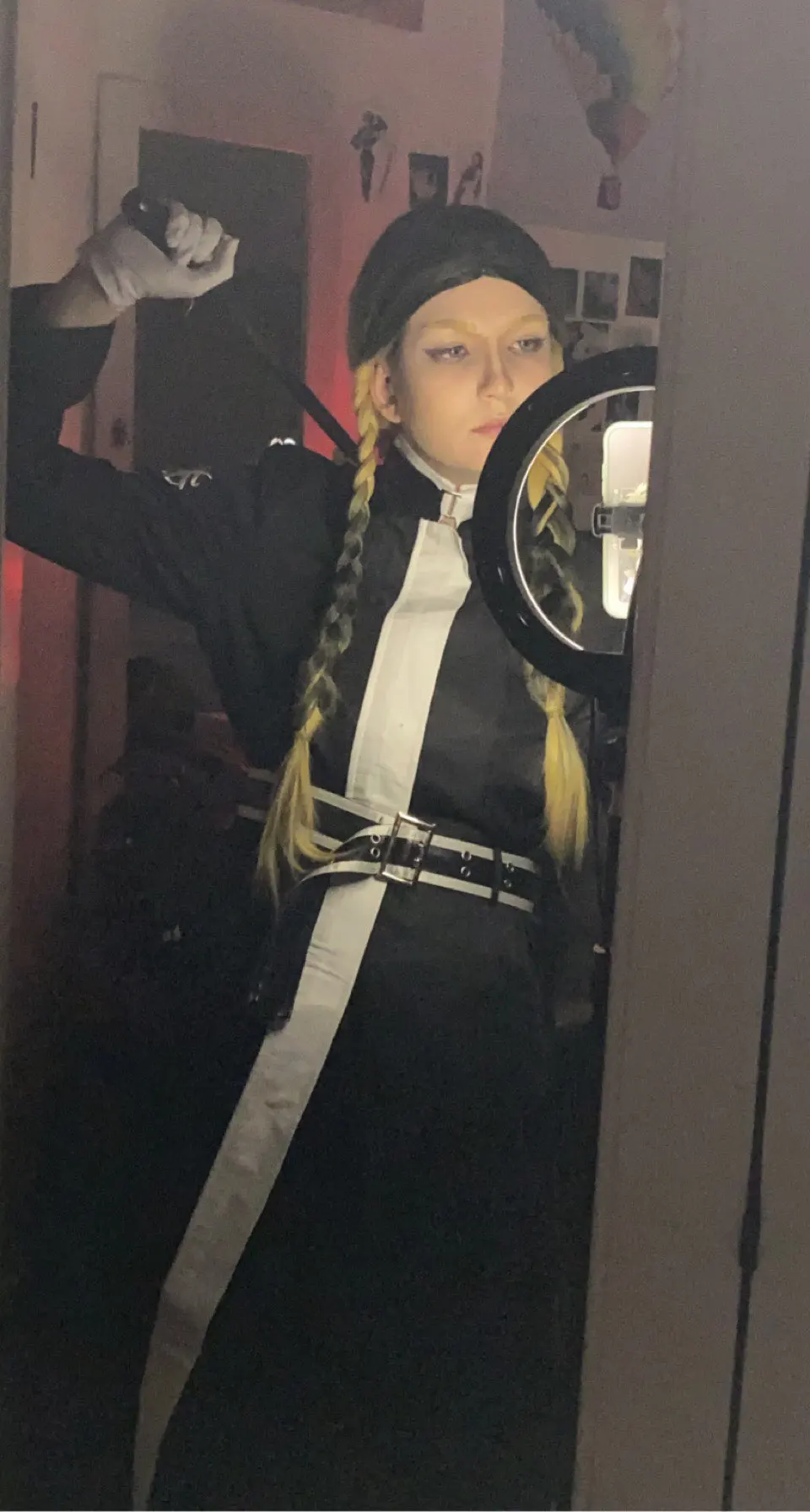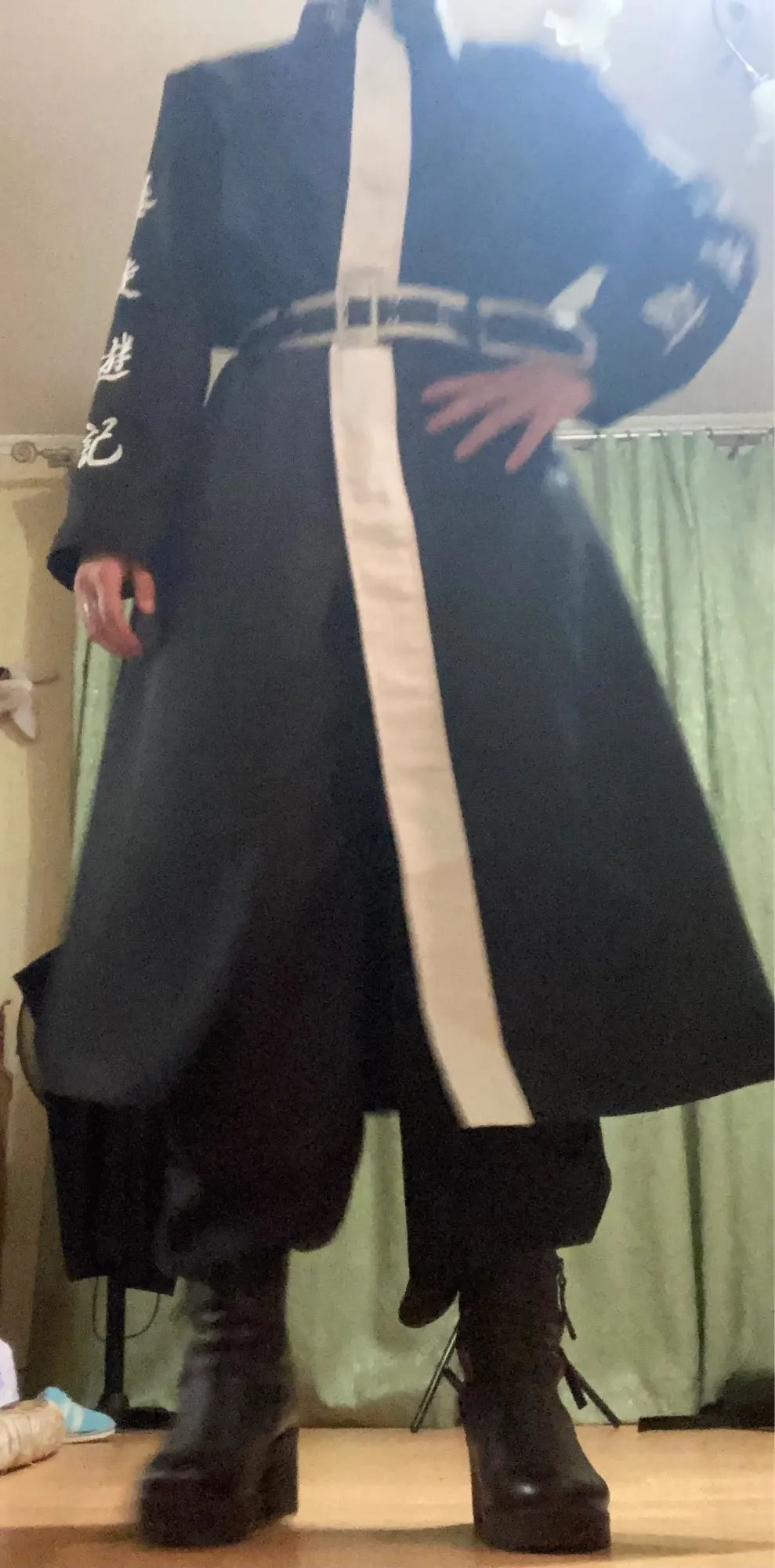 качество так себе, синтетика. радует, что есть подкладка и подпоечники. размер S оказался слегка большеват ( придется ушивать видимо) молния не до конца, а где-то до середины, чтобы удобно было ходить. ремень из какой-то дешманской кожи. сверху где шея ремешок продевается через мтеллическуб штуку и лепится на липучку. мой рост ± 155 (и сама я маленькая) штаны на резинке, оказались длинными, широко сесть в них вполне можно. перчатки хорошенькие. в подарок положили брошь- черепушку. заказывал 11.11, пришло 21.11 в постомат (Москва) кандзи - вышивка. больше фото мне стало лень делать, тут в принципе достаточно отзывов. из-за того что синтетика, поблескивает. удобно, что можно надеть теплую кофту под низ и будет не холодно. не помню, была ли тут размерная сетка. мои, насколько я помню это обхват бедер почти 90, талия ~ 54, грудь где-то 80 с чем-то вроде