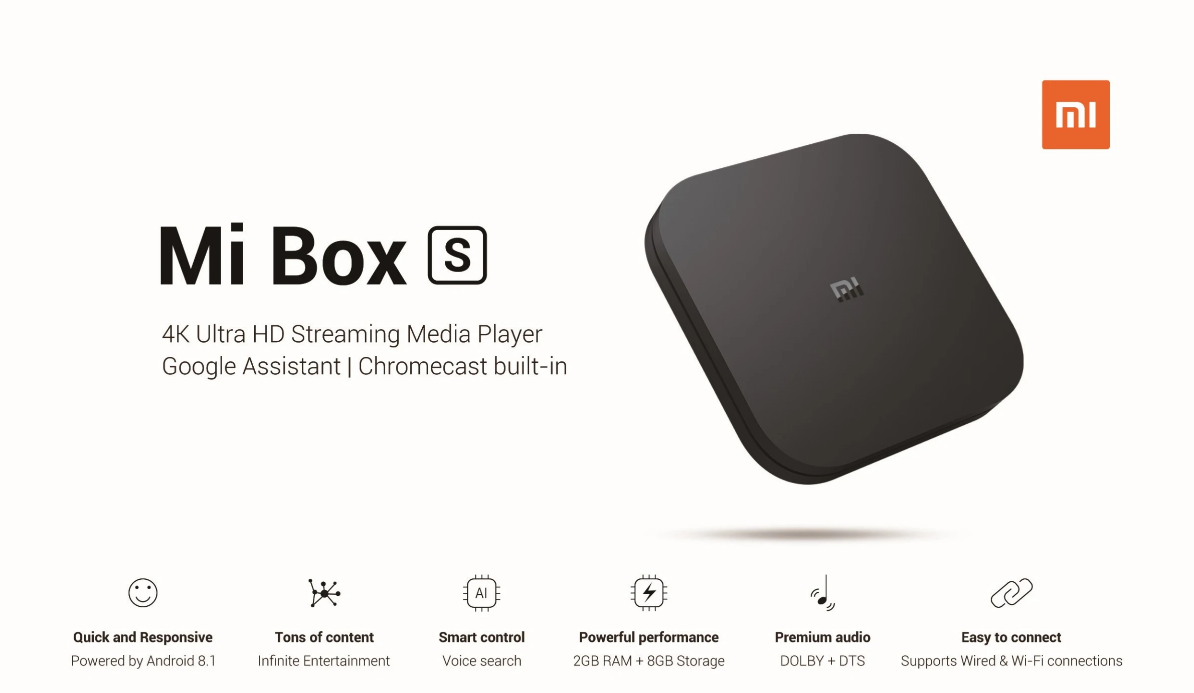 Бренд XiaomiМодель Xiaomi Mi Box SРазмеры Длина: 95,25 мм, ширина: 95,25 мм, толщина: 16,7 мм, вес: 147 г, цвет: черныйВыходное разрешение 4K (3840x2160)Процессор Cortex-A53 четырехъядерный 64 битGPU Mali-450Оперативная память 2 ГБ DDR3Память 8 ГБ eMMCОперационная система Android 8,1Беспроводное подключениеWi-Fi: 802.11a/b/g/n/ac 2,4 ГГц/5 ГГцBluetooth: 4,2Декодер видео декодер: 4K @ 60fps,VP9,H.265,H.264,MPEG1/2/4,VC-1,Real8/9/10Формат видео: RM,MOV,VOB,AVI,MKV,TS,Mp4,3DАудио декодер: DOLBY, DTSФормат аудио: MP3,APE,FlacДекодер изображения: JPG,BMP,GIF,PNG,TIFЯзык поддержки: ГлобальныйРазъем HDMI2.0a x 1,USB2.0 x 1, интерфейс питания x 1, аудиовыход x 1Упаковочный листПульт дистанционного управления x 1Руководство пользователя x 1Адаптер питания x 1Кабель HDMI x 1