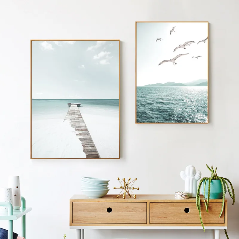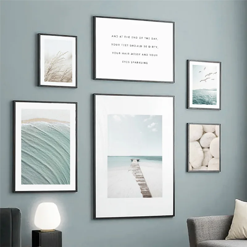 Синий пляж Простой и современный пейзаж плакаты и принты настенные художественные картины Декоративная Картина на холсте для декора гостинойМатериал: холстПосылка: фотография