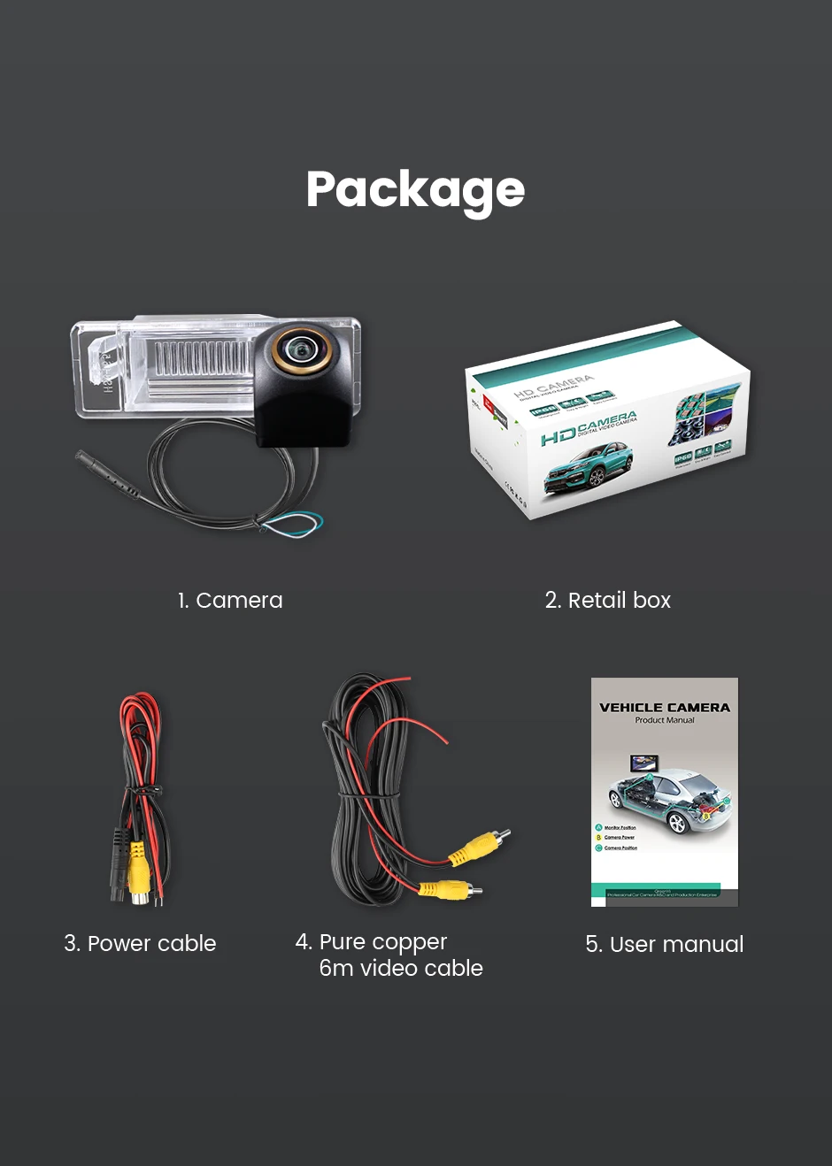 1. Камера заднего вида2. Розничная коробка3. Кабель питания4. Чистый медный 6 м видео кабель5. Руководство пользователя