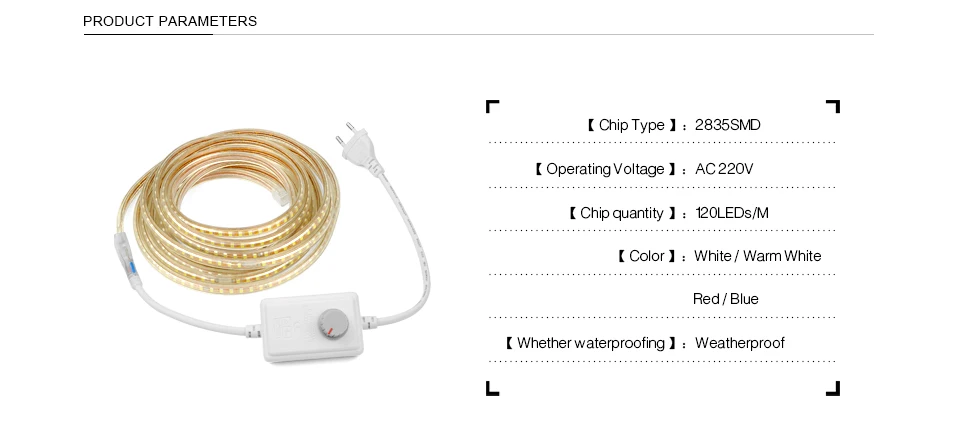 1. Товар: 220V светодиодный полосы светильник2. Диммируемая: Нет/да (с диммером)3. Цвет излучения: красный/синий/теплый белый/белый4. Количество светодиодов: 120 светодиодов/метр5. Входное напряжение: ac220в6. Водонепроницаемость: Да. IP65 водонепроницаемый7. Цветовая температура: белый (6000K-6500K) ; Теплый белый (2800K-3500K)8. Светодиодный Тип: 2835 SMD9. Длительный срок службы:> 50000 часов10. Сертификация: CE & RoHS11. Материал: провод из чистой меди