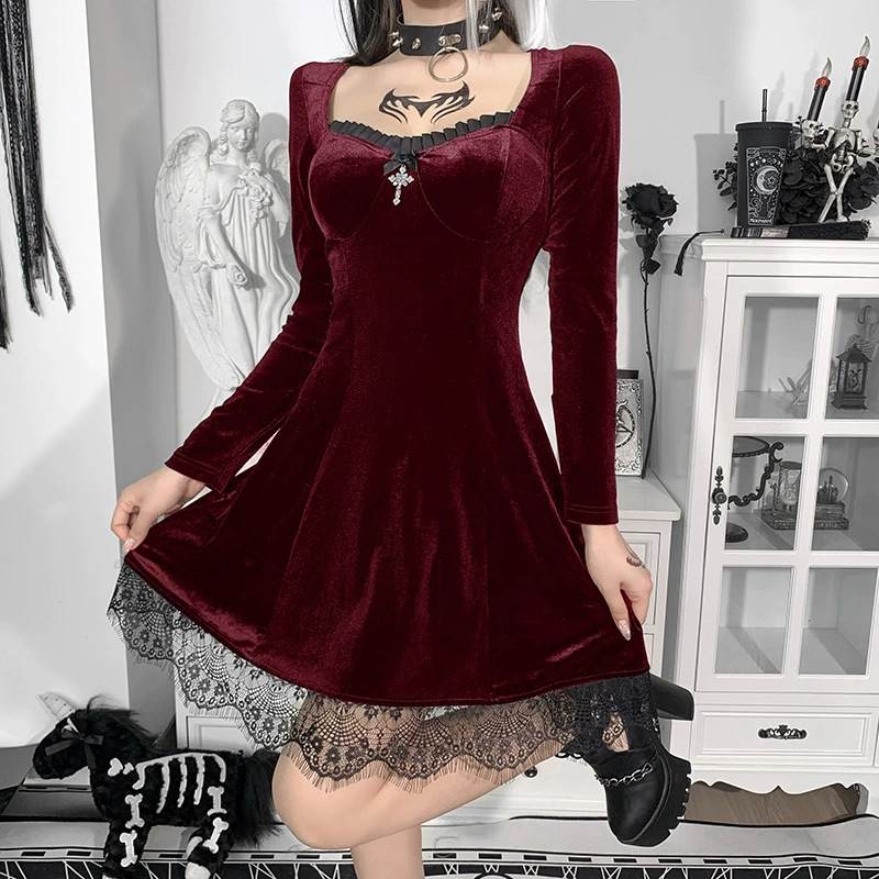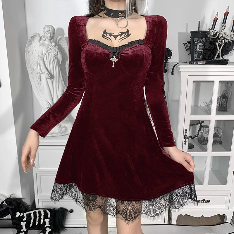 Женское платье с длинным рукавом, винтажное велюровое платье-трапеция в готическом стиле, облегающее платье с кружевной отделкой, одежда для осени