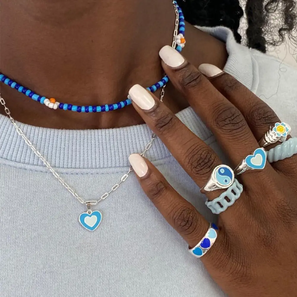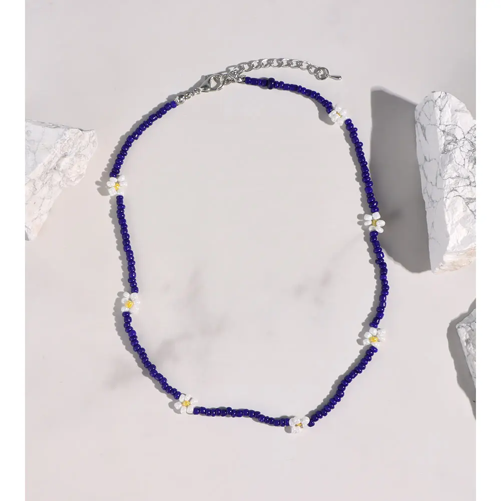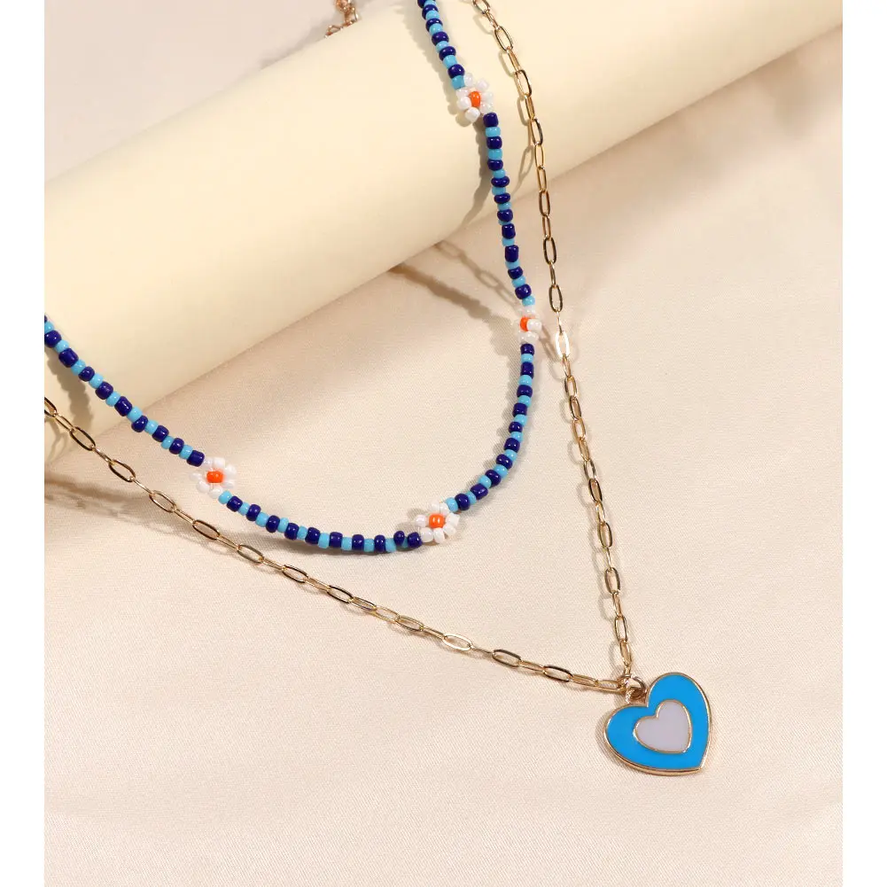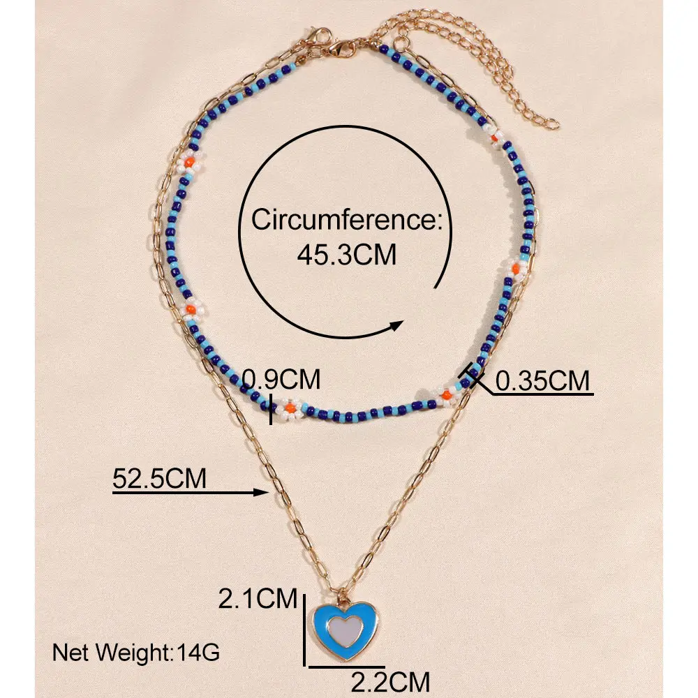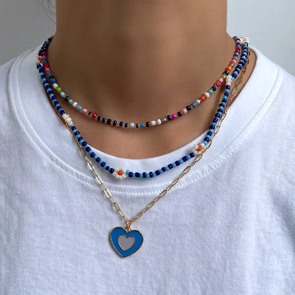 Чокер ручной работы в богемном стиле Женский, многослойное ожерелье с синими бусинами-маргаритками, подставкой и бусинами в форме сердца из глазурованного стекла, ювелирное изделие