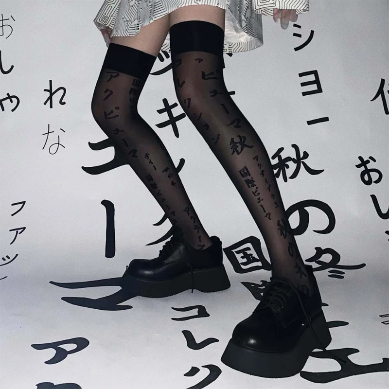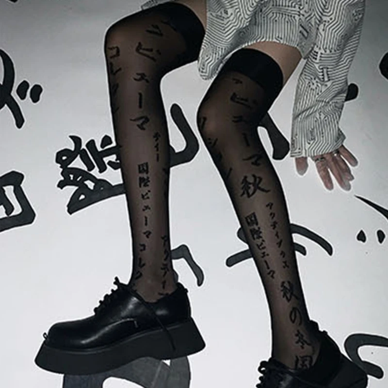 Женские тёмные готические черные шелковистые чулки до бедра в стиле панк Харадзюку с японскими буквами и принтом, жаккардовые летние длинные чулки выше колена в стиле "Лолита"