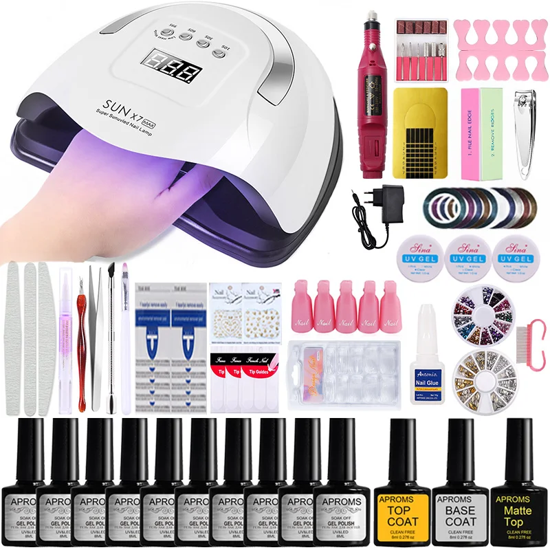 APROMS маникюрный набор включает в себя:1x120 Вт (57 светодиодов)/90 Вт (45 светодиодов)/72 Вт (36 светодиодов)/36 Вт (18 светодиодов)Светодиодная УФ-лампа для ногтей (Лечение всех гелей для ногтей)1 x ручной станок для сверления ногтей (0-20000 ОБ/мин)1 x Вилка питания (ЕС, США, Австралия, Великобритания; Выберите по вашей стране)6 Сверл С 6 шлифовальные ленты для ногтей2 x маникюрный сепаратор (случайный цвет)20 желтых форм для ногтей1 x четырехсторонний буферный блок для ногтей1 x Ножницы для ногтей с плоской головкой1 x клей для ногтей (10 г С клеевой щеткой)1 коробка золотой серебряный ноготь шпильки1 коробка цветных блесток для ногтей1 х мини-щетка для пыли (случайный цвет)10 x Ленточные линии для ногтей (случайный стиль)1 x ромб пилка для ногтей (grits:100*180)1 x прямой пилка для ногтей (grits:100*180)1 x пилка для ногтей (grits:100*180)1 x ручка для масла для кутикулы (случайный запах)1 x вилка для кутикулы (случайный цвет)1 x прямой ногтевой дизайн пинцеты1 x гвоздь из нержавеющей стали Толкатель1x Белый УФ-гель-щетка10 пар гель для ногтей3 листа французских наконечников (случайный стиль)2 листа клейкой 3d Золотой стикер для ногтей (случайный стиль)100 шт./компл. накладные ногти (прозрачный, полное покрытие, 10 размеров)5 шт./набор пластиковых зажимов для ногтей3 x УФ-гель (прозрачный, белый, розовый)1 х базовое пальто для фартуков1 х фартуки не протирать верхнее пальто1 х фартуки матовый топ caot10 x APROMS цветной гель для ногтей (Пожалуйста, сообщите нам ваш выбор цвета, или мы вышлем случайным образом)