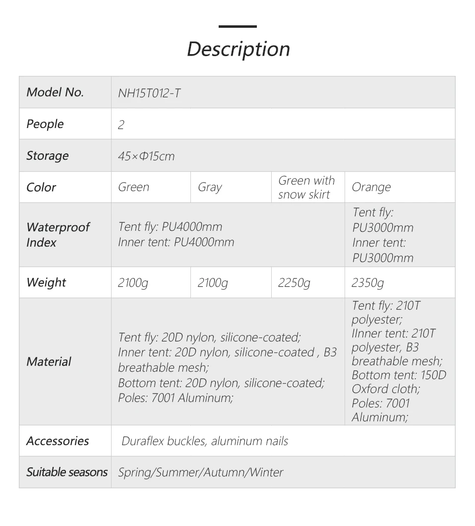 Аксессуары: наземный гвоздь * 11/ветряная веревка * 3/внешняя палатка * 1/Внутренняя палатка * 1/