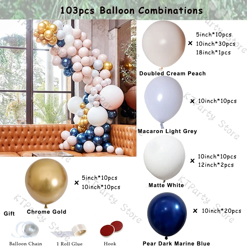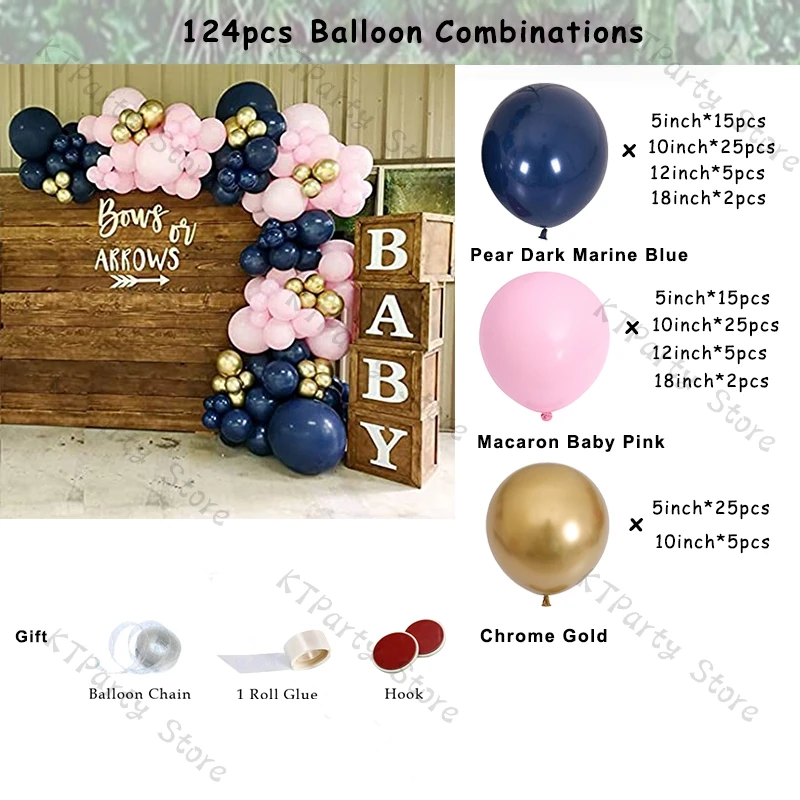 Матовый темно-синий (5 дюймов * 10 шт., 10 дюймов * 30 шт., 12 дюймов * 5 шт.)Macaron Baby Pink(5 дюймов * 10 шт., 10 дюймов * 30 шт., 12 дюймов * 5 шт., 18 дюймов * 1 шт.)Хромовое Золото 5 дюймов * 30 штБесплатно: рулонный клей * 1(100 шт)Воздушная цепь * 1(5 м)Крючок * 3