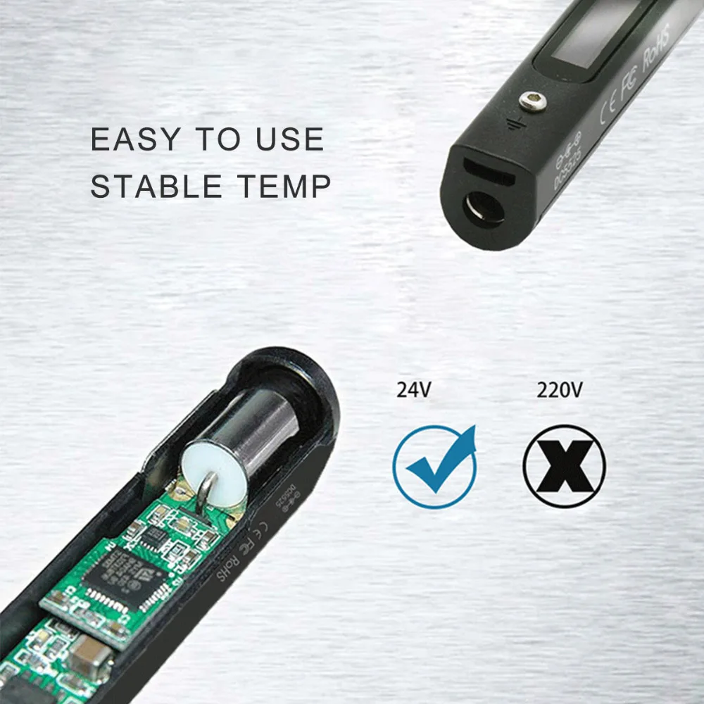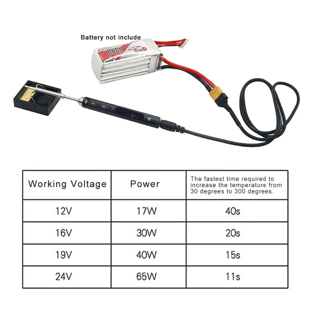 Может работать с 12-24 В постоянного тока, OLED-дисплеем, ключевой регулировкой температуры, внешним независимым источником питания. В постоянном токе 19 в 40 Вт, 15 секунд подъема температуры до 300 ℃.