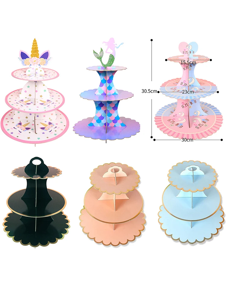 3-слойный Круглый картонный держатель для капкейков с изображением единорога и русалки, складной декор для дня рождения, свадьбы, десертный стол