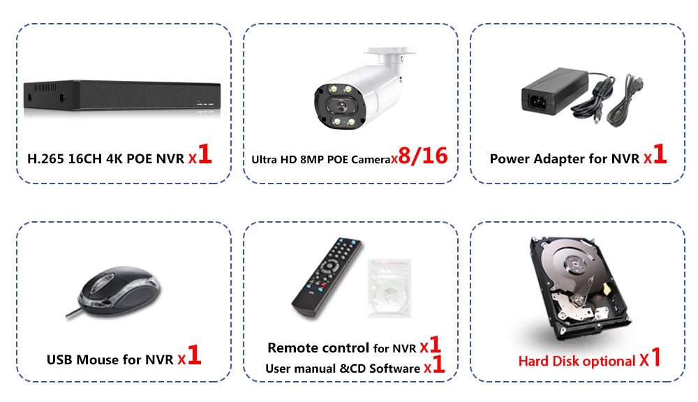 1 сетевой видеорегистратор H.265 16CH 4K & 8MP POE NVR;8/16 X H.265 HD POE аудио 8.0MP IP Крытый Открытый ИК День ночного видения атмосферостойкие камеры;1 x Блок питания для NVR;1 х USB мышь для NVR;1 компакт-диск программного обеспечения для NVR;1 пульт дистанционного управления для NVR;Жесткий диск опционально!