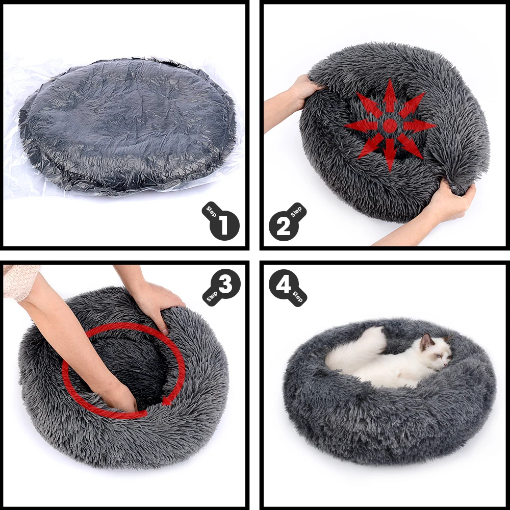 Во время длительных поездок форма кровати может не быть очень пушистой из-за вакуумного пакета, пожалуйста, выполните следующие действия, чтобы восстановить свою истинную форму. Шаг 01: Откройте вакуумный пакет. Шаг 02: растяните край кровати вокруг. Шаг 03: прижмите коврик внутрь. Шаг 04: готовы прилечь вашим милым питомцам.