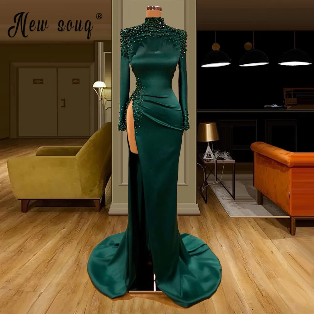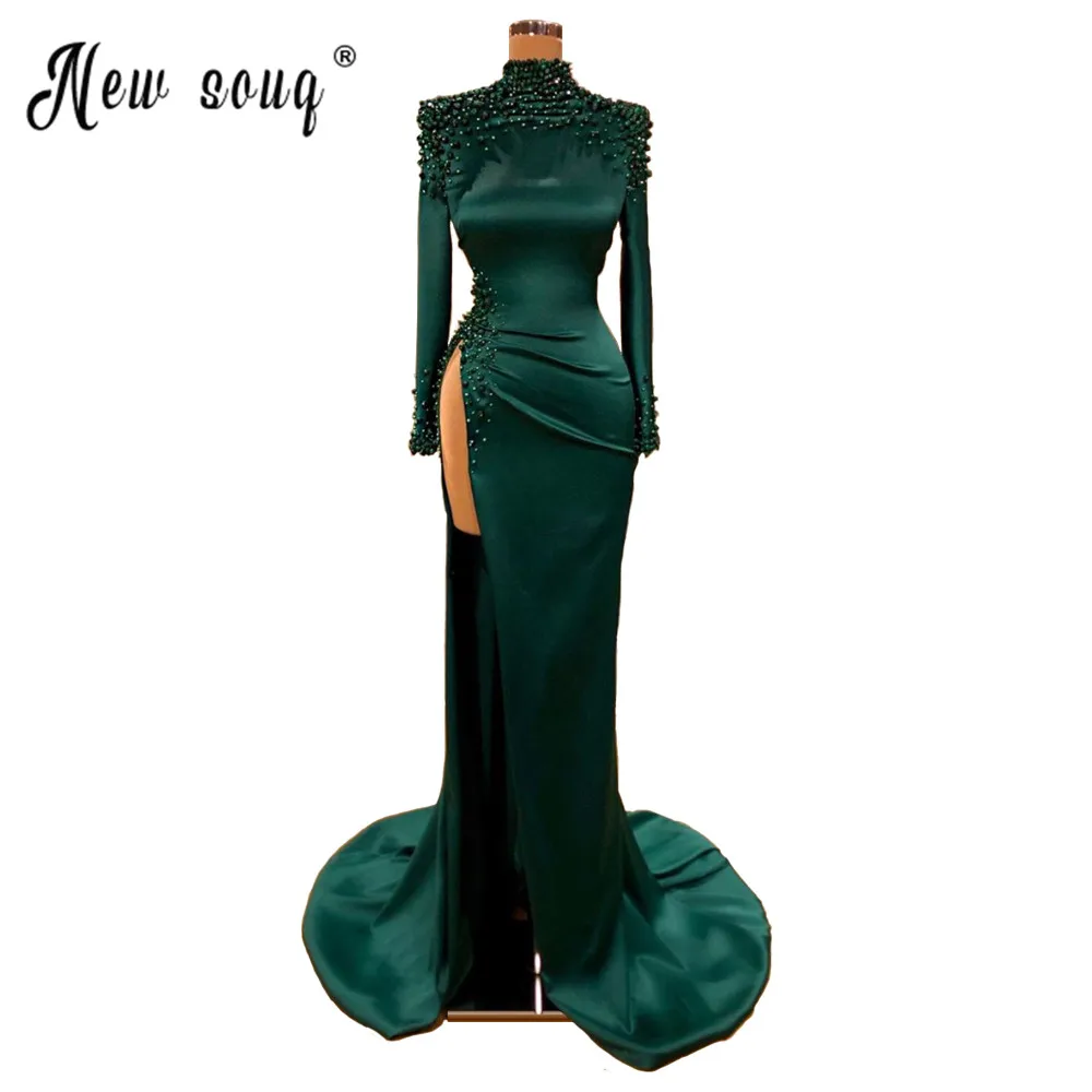 Мусульманское с высоким воротником вечернее платье с длинным рукавом 2021 жемчуг Сплит Сторона Выпускные платья арабский Vestidos De Fiesta одежда для дня рождения