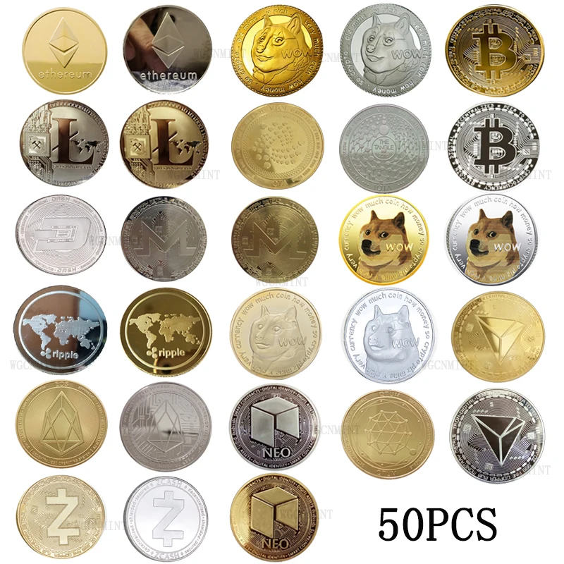 50 шт. 40*1,5 мм позолоченные серебряные биткоиныэфириумлитекоинDashADAEOSDogecoinQTUMTRX реплики физические криптовалюты Декор