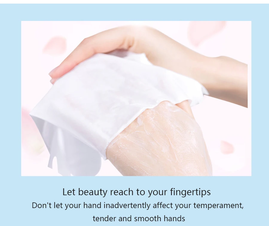 Очистите руки и высушите их, затем Наденьте маску для рук, чтобы руки были полностью прикреплены к пленке. Нанесите на 20-40 минут и массируйте обе руки во время использования. Снимите маску для рук, аккуратно массируйте до впитывания, затем снимите краску с воды.