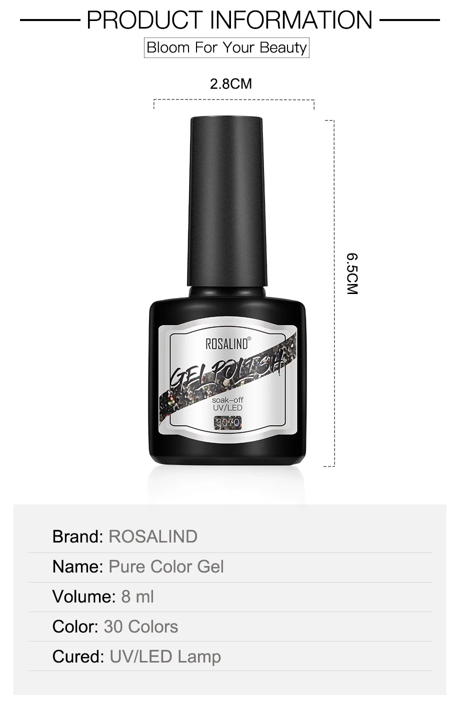ROSALIND Блестящий яркий лак для ногтей многоцветной дизайн ногтей отмачиваемый гибридные Лаки Vernis полуперманентный для маникюраХарактеристики Товара:Бренд: ROSALINDНазвание: чистый цветной гельОбъем: 8 млЦвет: 70 цветов sИзлеченная: УФ/Светодиодная лампа -Качество-наш первый приоритет.-Светильник, почти без запаха (только верхнее покрытие и основа имеют умеренный запах), мы применяем только органическую текстуру для защиты вашего здоровья.-Цвет будет сиять до 30 дней.-Цвета на выбор, подходят для всех случаев. Шаг за шагом:-1. Форма ногтя. Слегка смочите поверхность ногтевой пластины. Дезинфицировать.-2. Нанесите базовый слой основы от кутикулы до свободного края (не забудьте запечатать край ногтя). Высушите ногти под светодиодный светильник в течение 10 секунд или УФ-светильник в течение 2 минут.-3. Нанесите тонкое пальто отмачиваемого геля на выбор. Свободный край крышки. Лечение: 30 секунд в светодиодный светильник, или 2 минуты в УФ-лампе.-4. Повторите 2-е тонкое покрытие отмачиваемого гель-лака на ногти. Высушите под светодиодный лампой в течение 30 секунд или УФ-светильник в течение 2 минут.-5. Нанесите верхнее пальто. Свободный край крышки. Лечение: 30 секунд в светодиодный светильник.-6. Удалите липкий остаток на ногтях с помощью очищающего средства. Затем нанесите питающее масло кутикулы для увлажнения влаги в кутикулу и кожу вокруг ногтя. Для удаления:-1. Отмачивайте ногти в акриловом удалителе в течение 5 минут.-2. Аккуратно Наденьте на каждый ноготь всю эмаль для ногтей. Внимание:1. Объем составляет 8 мл. Поскольку емкость бутылки составляет более 8 мл, гель для ногтей не будет полностью заполнен бутылкой!2. Плотно закрываются. Держите подальше от солнечного света. Хранить в недоступном для детей месте.