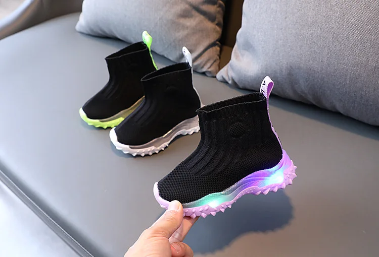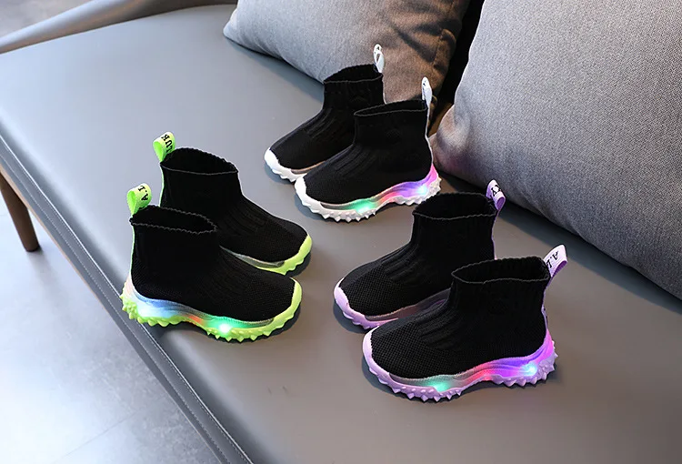 Осенняя повседневная обувь, детские светящиеся туфли со светодиодной светильник кой, черные эластичные тканевые кроссовки для девочек и малышей, обувь для мальчиков