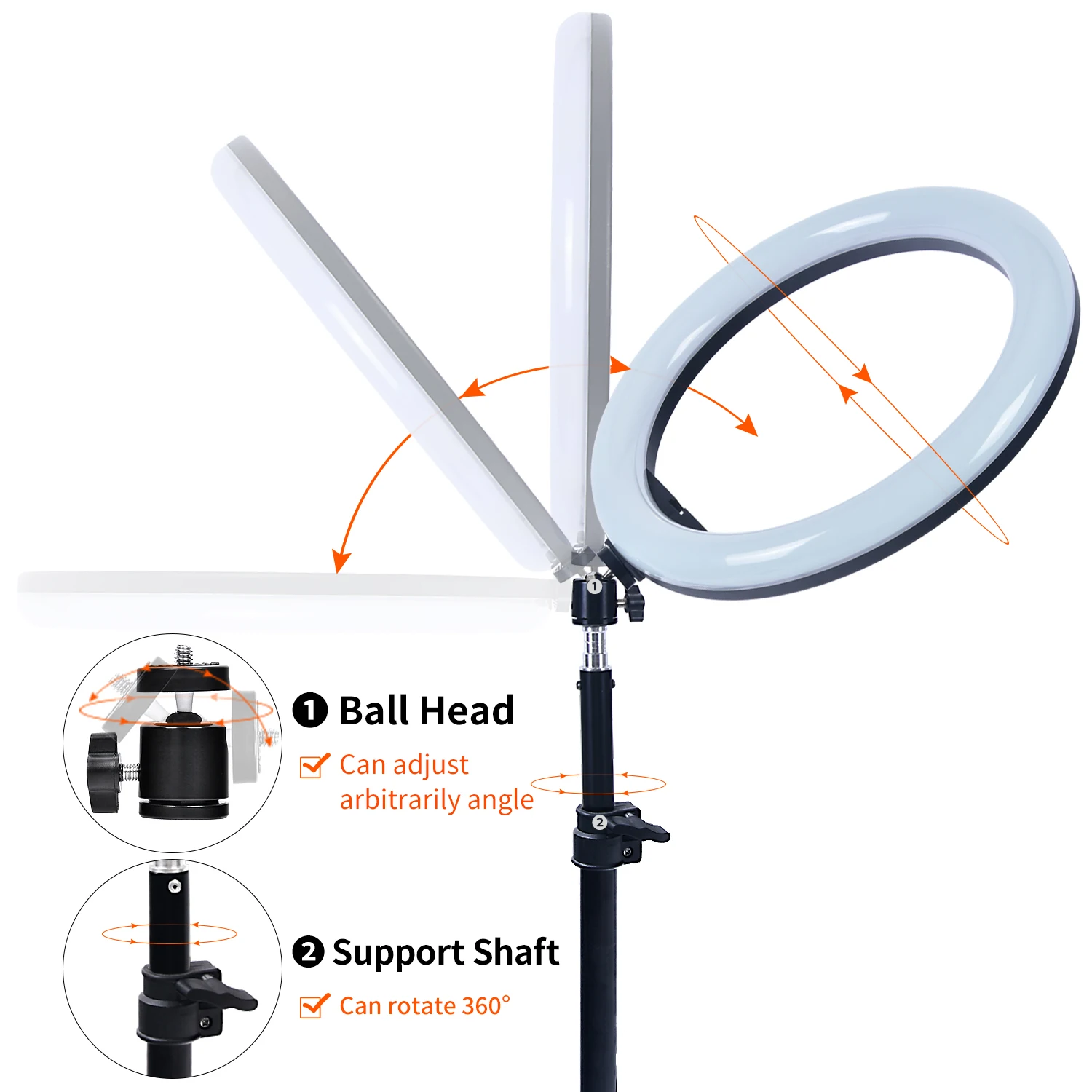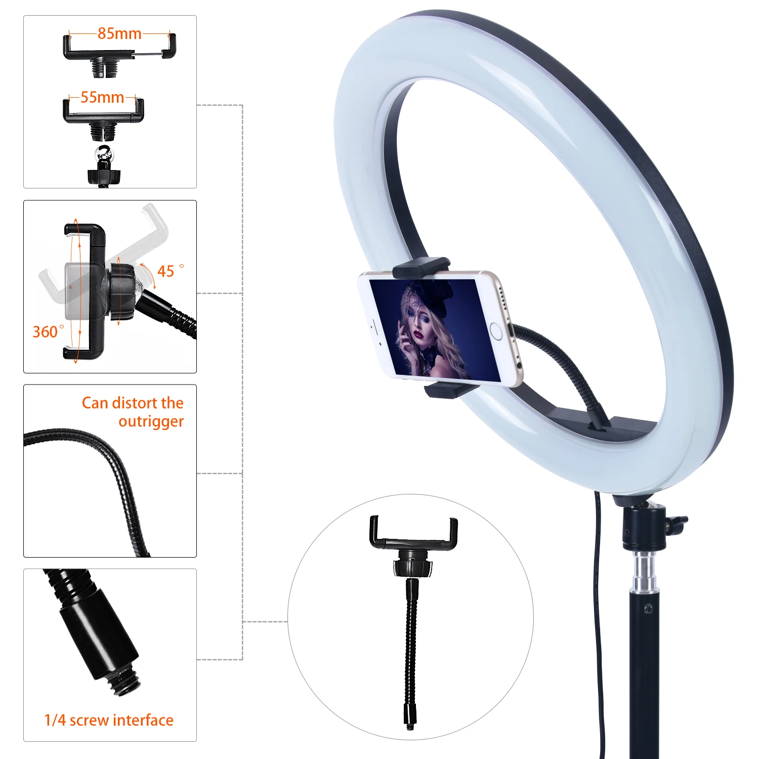 4.【Adjustable Регулировка вращения Head】Set этот 10-дюймовая цветная (RGB) кольцевой светильник под любым углом, регулируя его 360 ° вращения головки. 2 крепления для телефона совместимы с большинством смартфонов, с или без чехлов, и могут быть прикреплены к центру кольцевого светильник или закреплены на тройном полюсе в портретном, ландшафтном, или любой идеальный угол, который вы хотите.