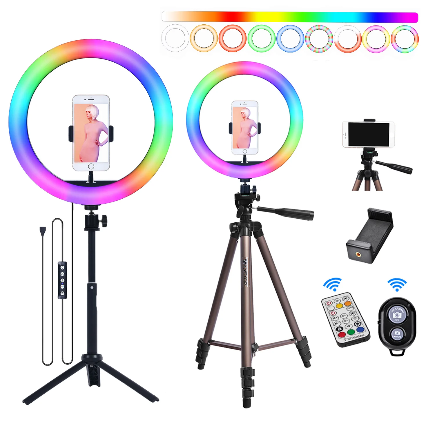 1. 【Различные и затемняемые rgb-кольца. Характеристики 10 уровней яркости и различных цветовых режимов (3 нормальных освещения-желтый теплый, теплый белый, белый + 15 RGB Освещение + 9 вспышек радужного освещения с 3 скоростями). Тусклый/Осветляющий уровни яркости и выберите идеальное освещение для создания удивительных фотографий/vidoes.