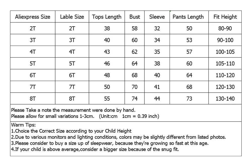 Одежда, которую Носите рядом с телом, должна быть более удобной.Поэтому мамы могут купить еще несколько для вашего ребенка.Подходит для трех сезонов: весны, осени и зимы. Это размер пижамы, измеренный на плоской подошве, пожалуйста, купите его в соответствии с размером ребенка.Ткань этой пижамы немного эластичная, но если вам нужна более свободная, рекомендуется покупать на размер больше. Aliexpress Размер 2T, размер 2T, Длина топа: 38, обхват груди: 58, длина рукава: 32, длина брюк: 50 см, Высота посадки: 80-90 смAliexpress Размеры 3t, этикетки Размеры 3t, топы Длина: 40, обхват груди: 60, рукав: 34, брюки Длина: 53 см, рекомендуемый рост: 90-100 см Aliexpress Размер 4T, размер 4T, Длина топа: 43, обхват груди: 62, длина рукава: 35, длина брюк: 57 см, Высота посадки: 100-105 см Aliexpress Размер 5T, размер 5T, Длина топа: 46, обхват груди: 64, рукав: 38, длина брюк: 60 см, Высота посадки: 105-110 см Aliexpress Размер 6T, размер 6T, длина топа: 48, обхват груди: 68, длина рукава: 40, длина брюк: 64 см, Высота посадки: 110-120 см Aliexpress Размер 7T, Размер 7T, Длина топа: 50, обхват груди: 70, рукав: 41, длина брюк: 68 см, Высота посадки: 120-130 см Aliexpress Размер 8T, Размер 8T, Длина топа: 55, обхват груди: 74, рукав: 44, длина брюк: 73 см, рост посадки: 130-140 см 1 дюйм = 2,54 cm1cm = 0,39 дюймовПри ручном измерении допускается погрешность в 1-3 см. Теплые советы:1. Выберите правильный размер в соответствии с ростом вашего ребенка2. Из-за различных мониторов и условий освещения цвета могут немного отличаться от приведенных фотографий.3. Пожалуйста, подумайте о том, чтобы купить одежду для сна на размер больше, потому что они растут так быстро в этом возрасте.4. Если ваш ребенок выше среднего, учитывайте больший размер из-за плотного прилегания. В: Являются ли фотографии изделий реальными? О. Да, все приведенные фотографии на 100% реальные. Все фотографии сделаны нами. Но оттенок цвета может меняться в зависимости от настроек монитора. Вопрос: как я могу оплатить свои покупки? О. Мы принимаем следующие способы оплаты: кредитная карта; Money Booker, T/T; Western Union. Вопрос: Есть ли Прямая поставка О: Да, мы осуществляем дропшиппинг, мы отправим посылка без каких-либо сведений о нас В: Когда ожидать доставку? О: Мы отправим ваши заказы в течение 1-5 дней (в зависимости от количества вашего заказа) после оплаты. Но чехол для любых горячих продуктов временно отсутствует на складе, мы свяжемся с Вами как можно скорее, чтобы попросить продлить или изменить другие товары или любое ваше предложение. В. Есть ли какой-либо номер отслеживания для моего товара? О: Да, мы отправляем каждый заказ с номером отслеживания, и вы можете проверить его на этом веб-сайте отслеживания:Https://global.cainiao.com В: Я реселлер, я хотел бы купить много штук вашего товара, какова оптовая цена? О: Спасибо за ваш запрос. Если вы хотите купить большое количество, пожалуйста, свяжитесь с нами. Мы предоставим вам лучшую цену. Спасибо. О отзывы 1. Если вы довольны нашим товаром и обслуживанием, пожалуйста, оставьте положительный отзыв и оценку в 5 звезд. 2. Если вы не довольны нашими товарами, пожалуйста, свяжитесь с нами, прежде чем оставить негативный отзыв. 3. Мы гарантируем, что мы будем 100% любить любую проблему для вас и сделать вас удовлетворенными .