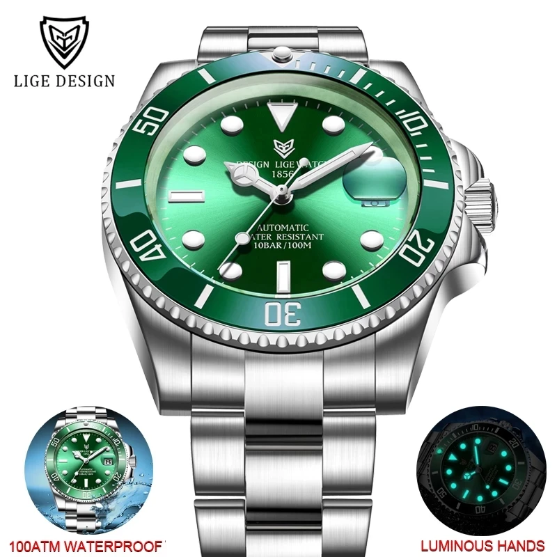 Часы наручные LIGE Мужские автоматические, механические модные водонепроницаемые из нержавеющей стали 316L с сапфировым стеклом