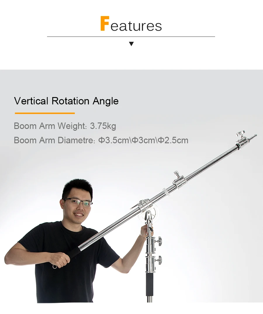 Эта стрела изготовлена из нержавеющей стали. Он идеально подходит для студии или на месте съемки и отлично подходит для задней панели светильник фоны или волос светильник.