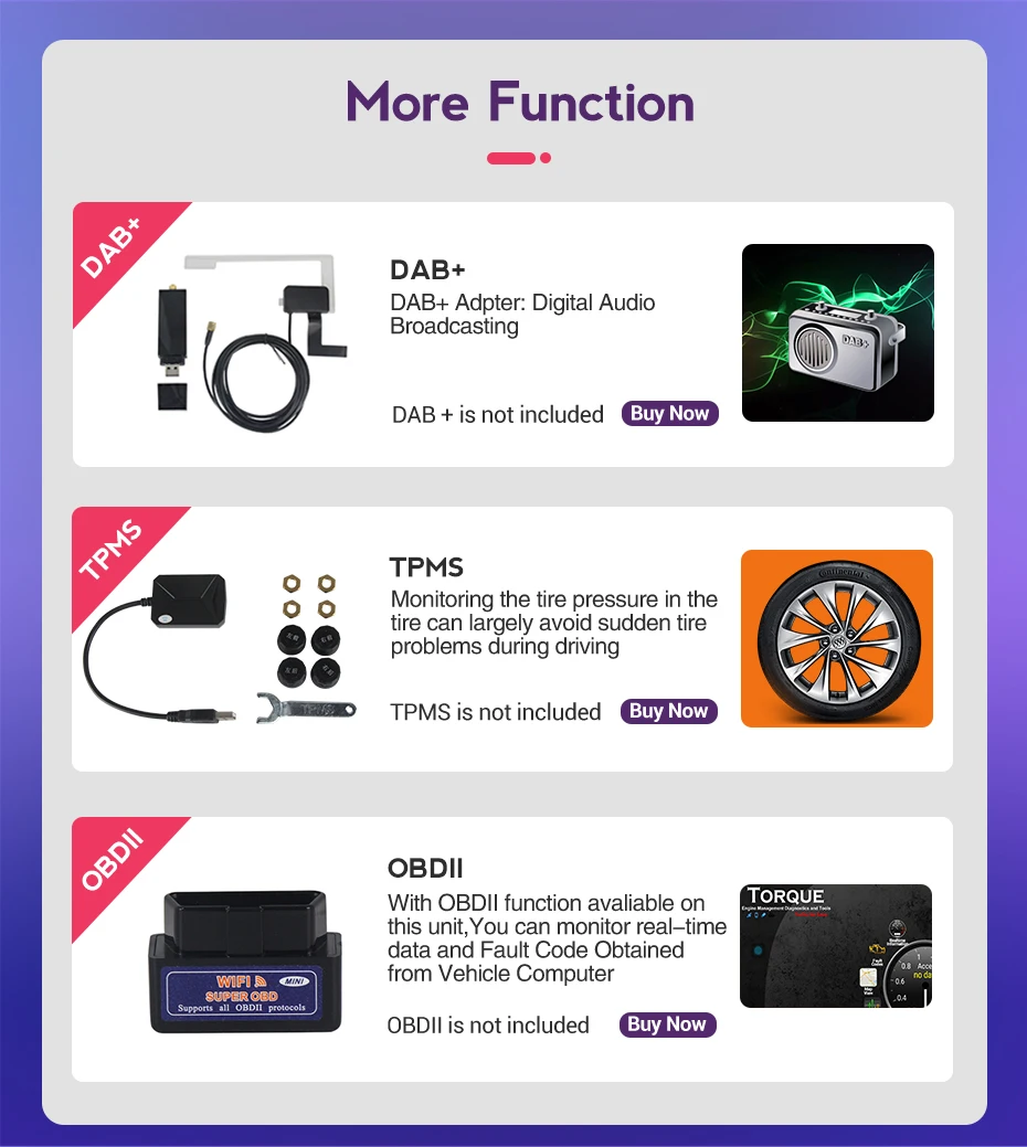 supportOBD2 DVR DAB+ TMPS rear view camera