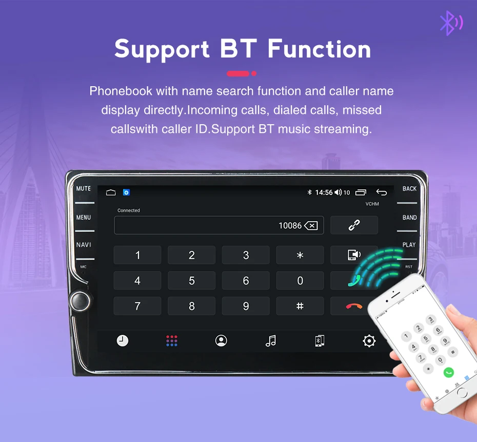 > Встроенный BT> Автомобильная стереосистема оснащена встроенным Bluetooth и функцией телефонной книги. Вы можете синхронизировать телефонную книгу с вашего мобильный телефон на этот блок, а затем сделать мобильный телефон без рук удобным и быстрым. Вы также можете наслаждаться беспроводным воспроизведением музыки с вашего устройства bluetooth.