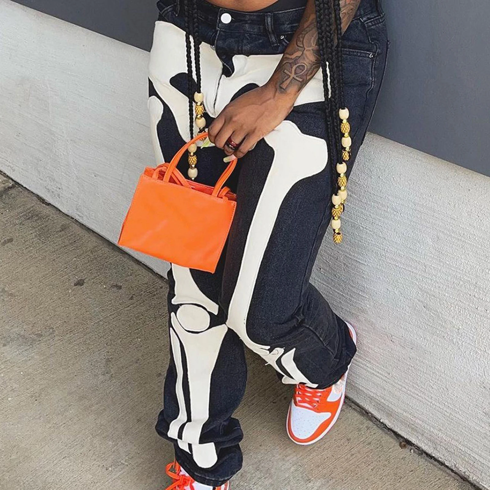Dourbesty Y2K готические джинсовые брюки со средней талией и принтом черепа, облегающие винтажные женские длинные брюки 90-х годов, уличная одежда в стиле E-girl, джинсы