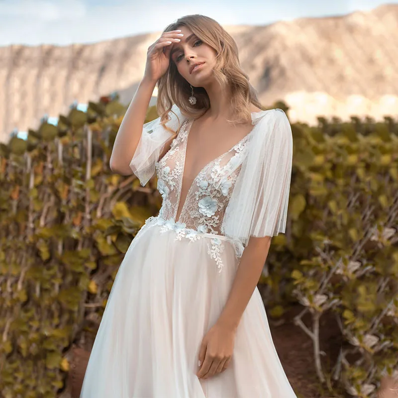 Платье Свадебное прозрачное в стиле бохо, с 3D цветами и V-образным вырезом