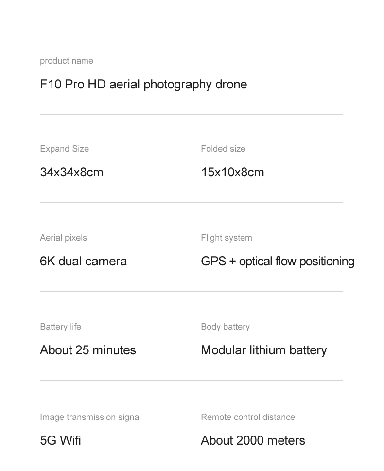 Номер товара. : F10Частота: 2,4G/5G (опционально)Канал: 4CHGy ro: 6 ax isДвигатель: 8*23 мм без щетокАккумулятор квадрокоптера: 7,4 в 2000 мАч Lipo (входит в комплект)Передатчик Батарея: 3x1,5 AAA Батарея (не входит в комплект)Время полета: 23-25 минутВремя зарядки: 120-150 минутРасстояние дистанционного управления: 300-500 мЦвет: как показаноКамера дополнительно: 2,4G WIFI 1080P/2,4G WiFi 4K HD/5G WiFi 4K HD/5G WIFI 1080PFOV: широкий угол 120 °1080P пикселей:Изображение: 1920*1080 (сохранить на мобильный телефон)Видео: 1920*1080 (сохранить на телефоне)4K пикселей:Изображение: 3840*2160Видео: 3840*1080APK: (поддерживает IOS 6 или выше и Android 4,4 или высококлассные системы)Четырехсторонний Размер:Размер складывания изделия (см): 15*10*8 смРазмер (см): 34*34*8 смОсобенности:-С складными ручками, компактно и легко носить с собой.-Режим позиционирования GPS может обеспечить более точный полет.-С функцией Wi-Fi 5G/2,4G, можно подключить к приложению, системе APK, чтобы делать фотографии/видео, передавать изображения в режиме реального времени через мобильный телефон-камеру-5G Wi-Fi fpv расстояние может достигать 300 м.2,4G WIFI 1080P/2,4G WiFi 4K HD / 5G WiFi 1080P/5G WiFi 4K HD камера может предоставить различные изображения и видео высокой четкости.-С функцией режима удержания высоты, он может обеспечить стабильный полет.-Орбитальное движение сделает самолет лететь кругами, обеспечивая более холодный угол съемки.-Режим полета Waypoint, просто нарисуйте маршрут на экране и используйте вертолет в качестве заданного пути.-Время полета до 25 минут.-Безголовый режим, не нужно регулировать положение самолета перед полетом.-Функция возврата одним нажатием кнопки, вы можете легко найти свой путь домой.-Взлет/посадка одним щелчком. Одним нажатием кнопки взлета или посадки автоматически, Дрон будет снимать или возвращать в положение взлета.-Защита от перегрузки по току при низкой мощности.-Анти-помех использует 2,4 ГГц технологии.-4 канала, вы можете летать вверх, вниз, вперед, назад, влево, вправо.-Шестиосевой гироскоп для более стабильного полета и более легкого управления.-Он имеет 3 уровня переключения скорости полета, чтобы сделать полет более веселым.-Четырехроторный фюзеляж изготовлен из высокопрочного, высокопрочного инженерного пластика, который является светильник и долговечным.Функции:Вверх/вниз, вперед/назад, влево/вправо, боковой F светильник, уровень 3 F светильник скорости, светодиодный светильник, следуй за мной, F светильник вокруг, Waypoint F светильник, режим удержания высоты, безголовый режим, возврат одной кнопкой, Взлет/посадка одной кнопкой, WiFi FPV, камера/видеоПосылка включает в себя:1 x Квадрокоптер F101 пульт дистанционного управления1x3,7 V литиевая батарея (вы можете выбрать нужный номер, после чего батареек при заказе)1 х USB кабель для зарядки1 отвертка1 x Руководство пользователя2 запасных лезвияМы рекомендуем использовать наши оригинальные запасные части F10. Если клиент, который использует запасные части, такие как аккумулятор других продавцов и вызывает проблемы с дроном F10, мы не предоставляем гарантийное обслуживание.Общая проблема и решение:Вопрос: Почему дрон не может снимать при использовании приложенияО: если вы используете приложение, чтобы снять с помощью кнопки, вам нужно сначала использовать удаленную разблокировкуВопрос: Почему камера не может двигаться вверх и вниз с помощью пульта дистанционного управленияA: легкий, без карданного шарнира, фиксир