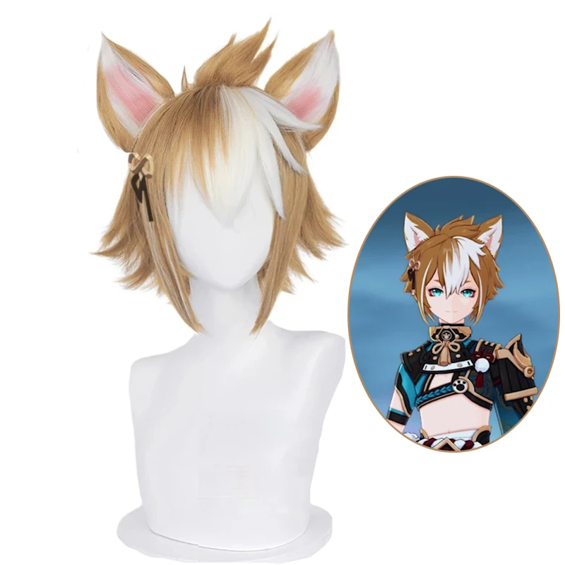 Парик для косплея Gorou, короткий, коричневый, белый, с ушками, из ...