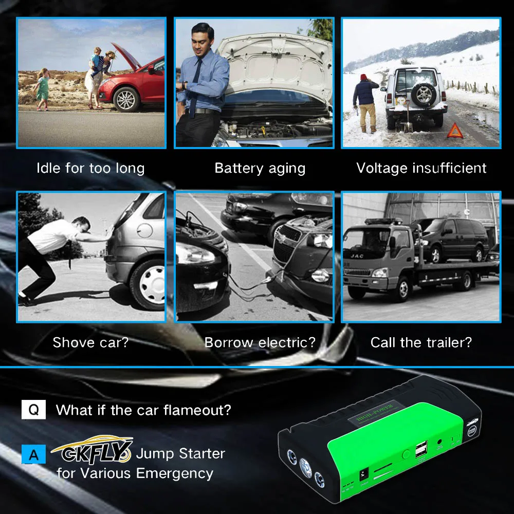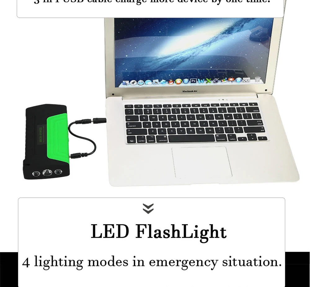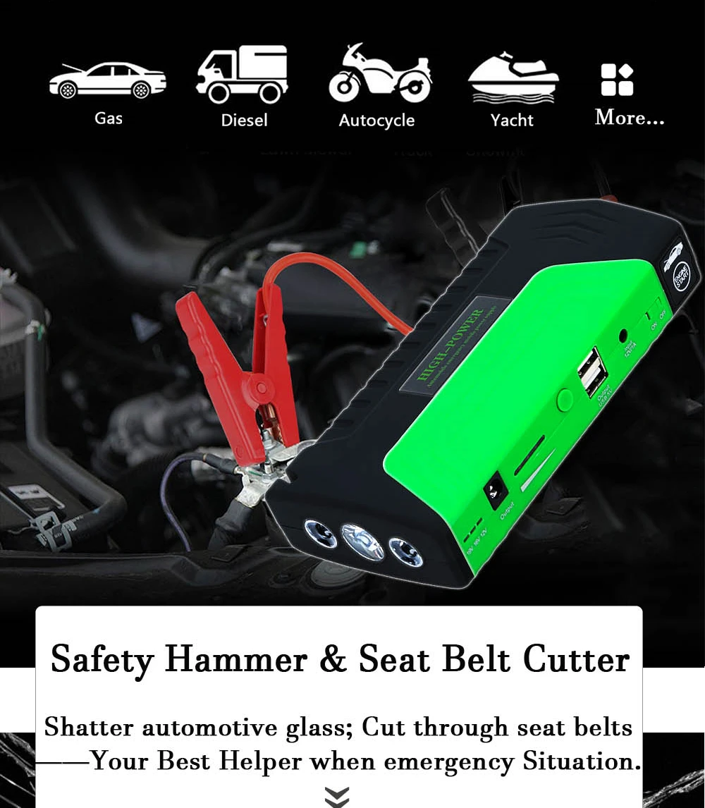 1. Пуск автомобиля 12V в чрезвычайных 2. Зарядка всех мобильных телефонов в аварийной ситуации (4 usb-разъема) 3. Заряжайте весь ноутбук в аварийной ситуации (4 разъема USB) 4. Высокая яркость, многомодовый светодиодный светильник для вспышки. SOS светильник 5. Мини Компас, молоток безопасности, ремень безопасности резак