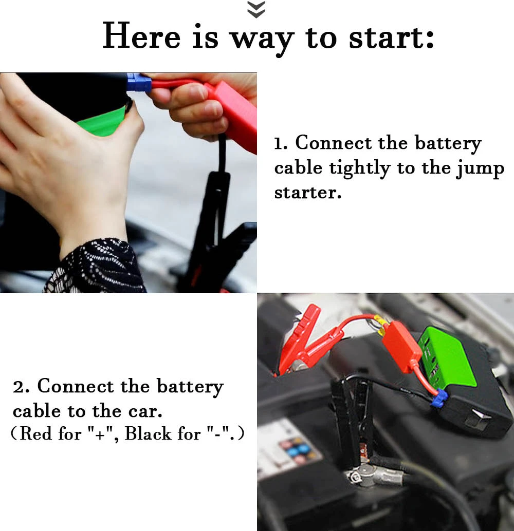 1. Для вашей безопасности, пожалуйста, не разбирайте стартер скачка. После демонтажа самостоятельно, мы не будем обслуживать любые возникшие проблемы. 2. Перед запуском двигателя убедитесь, что пусковое устройство полностью заряжено. 3. Если стартер скачка не может начать в одно время. Повторите попытку через 30 секунд или дольше и начните медленнее.