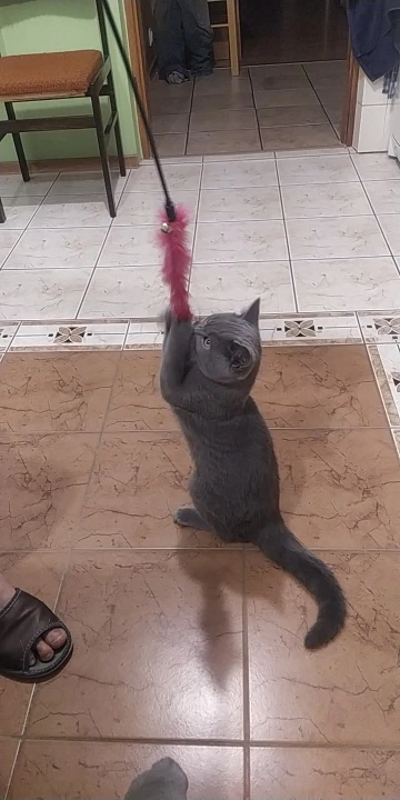 Привязала к резиночке, подвесила в дверном проеме. Кот в восторге