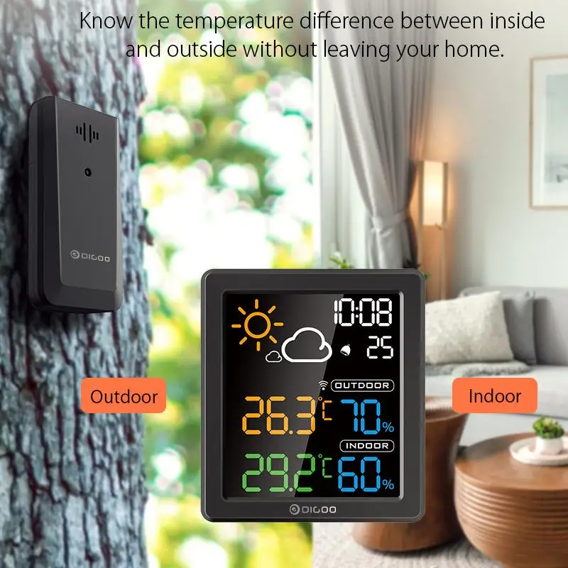 -Цветной экран высокого разрешенияРаспыленный экран для максимальной четкости под любым углом.-Прогноз погодыПроверяйте прогноз погоды на каждый день и никогда не попадайте под дождь без зонта.-Отображение температуры и влажности в помещении/на улицеУзнайте разницу температур внутри и снаружи, не выходя из дома.-Двойные сигналы с повтором сигналаПосле звука будильника нажмите верхнюю кнопку, чтобы успеть еще 5 минут.-Напоминание о низком заряде батареи датчикаНапоминает вам заменить батарею, чтобы Избежать неточных измерений