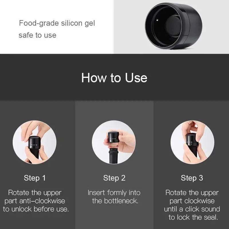 Шаг 1:Отвинтите верхнюю часть винной пробкиШаг 2:Поместите винную пробку в рот бутылкиШаг 3:Поверните верхнюю часть винной пробки обратно в исходное положение