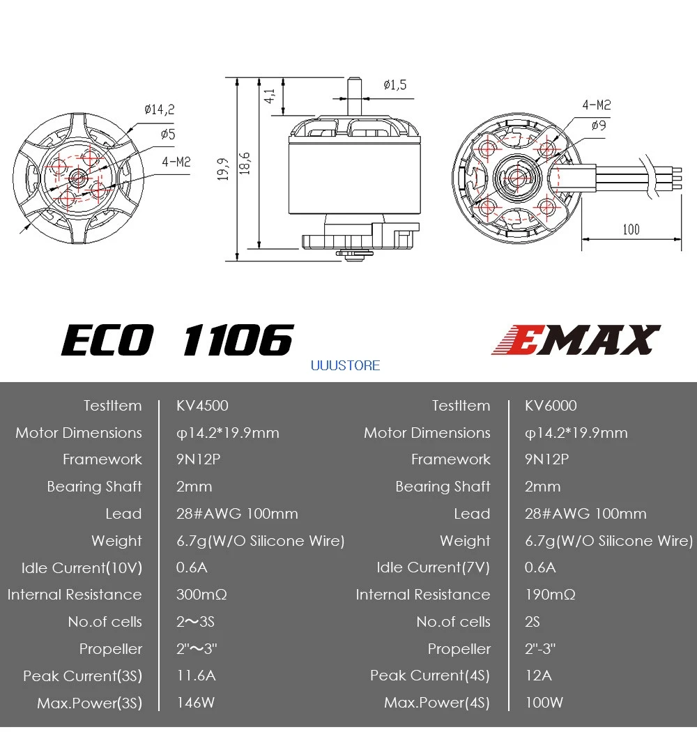 Резьба вала: CWТок холостого ходаВнутреннее сопротивлениеРекомендуем LipoРекомендуемый пропеллерПиковый токМакс. Мощность4500кв0.6A (10V)300mΩ2 ~ 3S2 ~ 3 дюйма11.A (3S)146 Вт (3S)6000кв0.6A (7V)190mΩ2S2 ~ 3 дюйма12А (4S)100 Вт (4S)