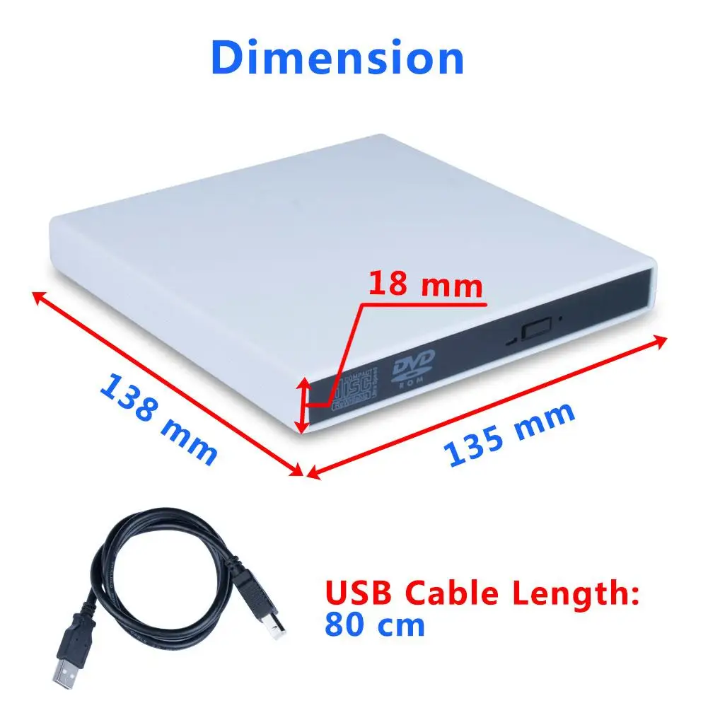 Характеристики:1. Название продукта: тонкий портативный оптический привод USB2. Тип: CD-ROM/DVD-ROM/привод3. Интерфейс USB: USB 2,04. Цвет: черный5. Выходное напряжение: 3 ~ 5 В (Примечание: Если напряжение слишком ниже, DVD не сможет работать.)6. Размеры изделия: 135x138x18 ммПодключи и играй.Скорость чтения:CD-ROM 24XCD-R 24XCD-RW 24XDVD-ROM 8XDVD-R 8XDVD-RW 8XDVD-RAM 6XИнструкции по использованию:1. Подключите этот продукт к USB-порту компьютера с помощью USB-кабеля, значок устройства отобразится в правой нижней части компьютера, при этом драйвер будет автоматически установлен на компьютер.