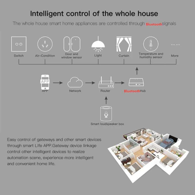 2. Беспроводной пульт дистанционного управления и Голосовое управление Alexa Google Home доступны с подключенным шлюзом Bluetooth, одним нажатием для подключения модуля переключателя к шлюзу Bluetooth для различных интеллектуальных функций; многоконтрольная связь включена в приложение Smart Life для другого способа детектора без помех.