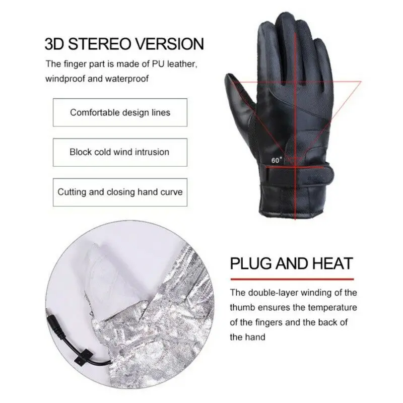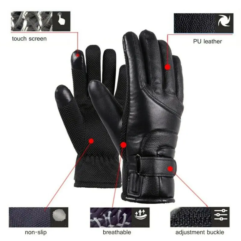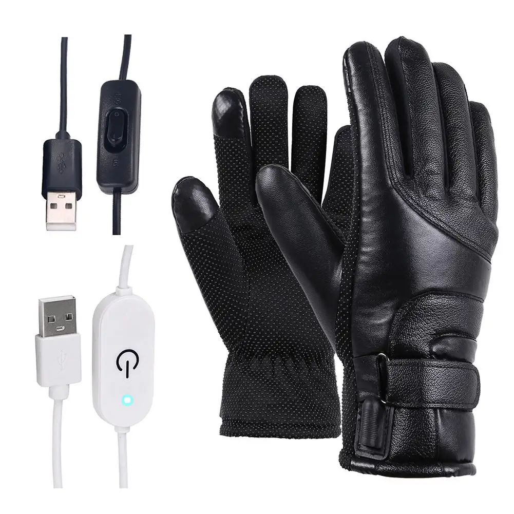 Зимние перчатки с электрическим подогревом, велосипедные теплые перчатки с подогревом, лыжные перчатки с плюшевой подкладкой, кожаные черные водонепроницаемые перчатки с USB-зарядкой