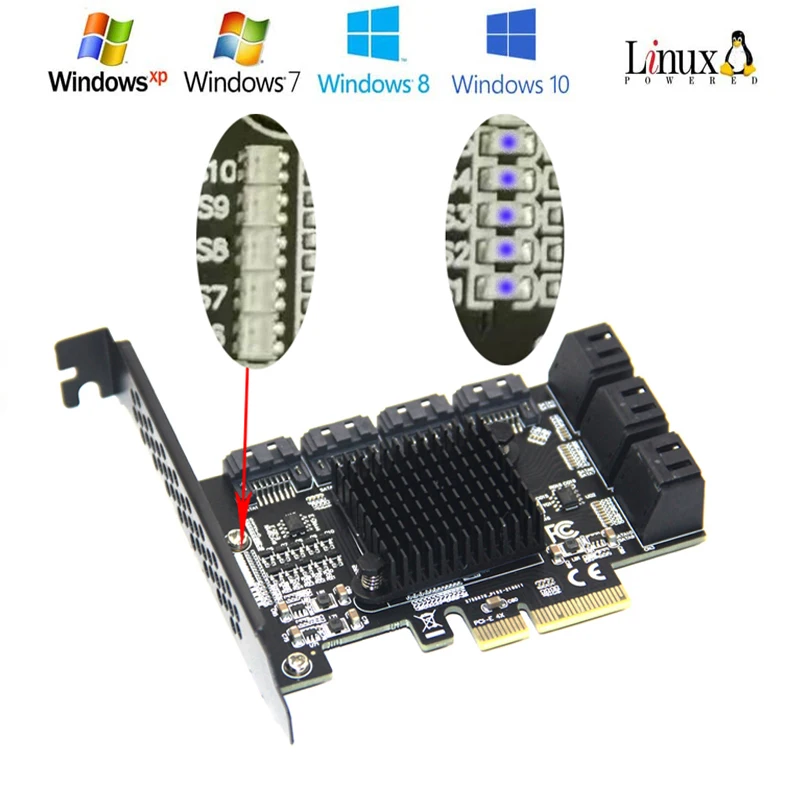 Описание:Совместим с серийными спецификациями SATA 3,0, обратная совместимость с SATA2.0 SATA1.0.Совместимость со спецификациями PCI-Express v2.0, обратная совместимость с PCI-Express v1.0.Поддержка скорости передачи 6,0 Гбит/с, 3,0 Гбит/с и 1,5 Гбит/с.Поддерживает Gen 1i, Gen 1x, Gen 2i, Gen 2m, Gen 2x и Gen 3i.Поддержка режима AHCI1.0 и режима IDE.Поддержка собственной очереди команд (NCQ).Поддержка FIS switch или command switch на основе мультипликатора порта.Поддержка горячей замены и горячей замены.Совместим с жесткими дисками SATA6G, 3G и 1,5G.Интерфейс шины: разъем PCI-Express x1Интерфейс расширения: 10 портов SATA3.0Системные требования: есть доступный разъем PCI Express X1, который также поддерживает PCI-E X2 X4 X8 X16Операционная система: Windows 10/8/ (32/64 бит) / Vista (32/64 бит) / 2003/2008 / linuxПримечание:Synology может распознавать только 4 диска, Пожалуйста, знайте!Карта PCI-E SATA3.0 должна быть установлена в слоте PCI-E материнской платы и не может быть вставлена в разъем PCI.Самая быстрая скорость для PCI-E 2,0 380-450 m / s. При подключении к PCI-E1.0 скорость составляет всего 200-300 м/с. Различные компьютерные конфигурации и SATA SSD имеют различные скорости.Если все порты используются одновременно, скорость замедляется.Мы рекомендуем использовать эту карту SATA 3,0 в слоте PCIE2.0 или 3,0 для быстрой скорости.Мультипликатор порта SATA не поддерживается, если драйвер не установлен.Нам нужно установить драйвер для распознавания всех дисков.Перед вставкой или удалением карты убедитесь, что компьютер выключен. Затем вставьте карту, чтобы избежать повреждения материнской платы или расширительной карты.Если нет CD-ROM, или компакт-диск с драйверами не читается, вы можете связаться с продавцом, чтобы отправить вам драйвер.
