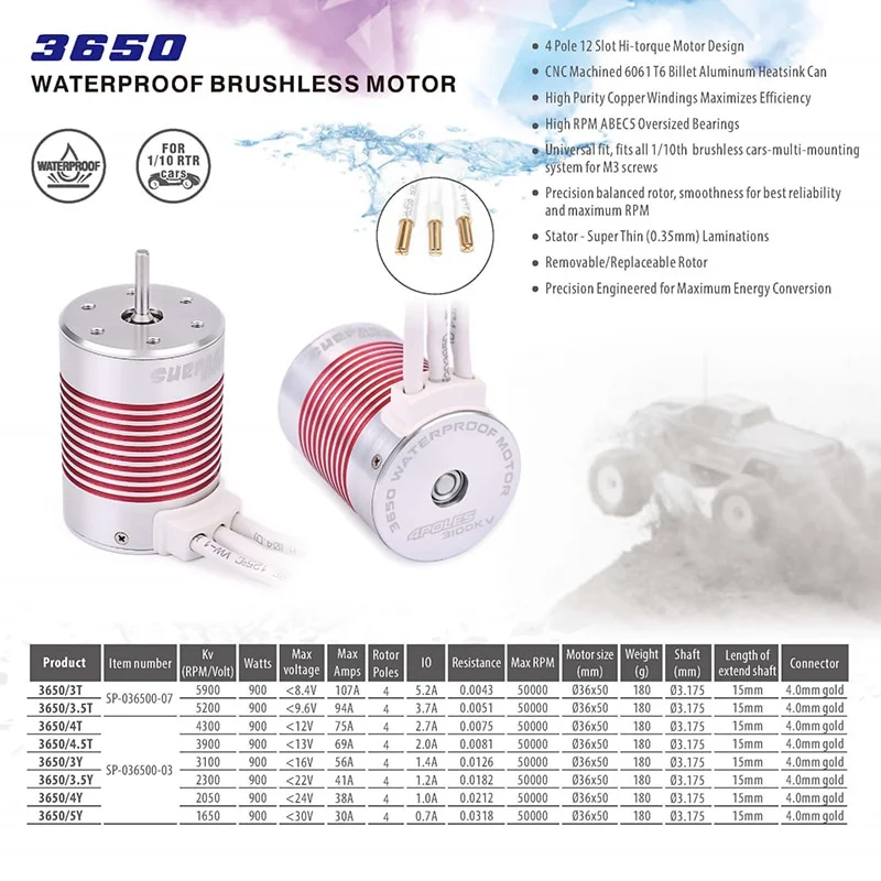 2845 характеристики:Бренд: SURPASSHOBYНазвание: Платиновый 2845КВ (об/мин/Вольт): 4370кв/3930кв/3100кв (опционально)Ватт: 800Макс. Об/мин: 50000Максимальное напряжение: <9 вМакс Ампер: 88AДиаметр: 28 ммДлина: 47 ммДлина вала: 15 ммДиаметр вала: 3,175 ммРазъем: 4,0 мм Золотой вилка типа бананВес: 118 гF540 Особенности:Водонепроницаемый, подходит для различных видов спорта.Специально разработан для 1/10 1/12 RC автомобиля.4-полюсный 12 Слот двигатель с высоким крутящим моментом дизайн.CNC обработанный алюминиевые заготовки 6061 T6 радиатор.Высокая чистота медных обмоток увеличивает эффективность.Высокие RPM ABEC5 негабаритные подшипники.Прецизионный сбалансированный ротор, гладкость для лучшей надежности и максимального оборотов в минутуСтатор-супер тонкий (0,35 мм) ЛаминированиеСъемный/сменный ротор.Множественные особенности защиты ESC: защита от отключения низкого напряжения для литиевой или никелевой батареи/Защита от перегрева/Защита от потери сигнала дроссельной заслонки/Защита от блокирования двигателя.ESC легко программируется и совместим с указанной карточкой программы карманного размера.Технические характеристики двигателя F540:Название бренда: SURPASSHOBBYРазмер: Платиновый водонепроницаемый F540Ватт: 800 ВтМаксимальное напряжение: <12 ВМакс Ампер: 66AКВ (об/мин/Вольт): 4370/3930/3300/3000кв (опционально)Макс. Об/мин: 50000Диаметр: 36 ммДлина: 50 ммДлина вала: 15 ммДиаметр вала: 3,175 ммТип штепсельной вилки: 4 мм Золотая штепсельная вилка типа бананаМонтажное отверстие: м3Вес: 146 г3650 Особенности:4-полюсный 12 Слот hi-крутящий мотор дизайн.Высокое качество: CNC обработанный алюминиевые заготовки 6061 T6 радиатор, высокая чистота медных обмоток увеличивает эффективность, высокаяОб/мин ABEC5 негабаритные подшипники.Универсальная посадка, подходит для всех 1/10 бесщеточные автомобили-мульти-Монтажная система для винтов M3.Точность баланс ротора катушки, обеспечивающий отсутствие вибрации, гладкость для лучшей надежности и максимальной скорости вращения, статор-супер тонкий (0,35 мм) пластин.Съемный/сменный ротор, точность разработана для максимального преобразования энергии.3650 характеристики:Бренд: SURPASSHOBBYНазвание: Платиновый водонепроницаемый 3650 RC моторКВ (об/мин/Вольт): 3100кв/3500кв/3900кв/4300кв/5200кв (опционально)Ватт: 900Макс. Об/мин: 50000Максимальное напряжение: <13 вМакс Ампер: 69AДиаметр: 36 ммДлина: 50 ммДлина вала: 15 ммДиаметр вала: 3,175 ммРазъем: 4 мм позолоченная вилка типа «банан»Вес: 181 г3660 Особенности:4-полюсный 12 Слот hi-крутящий мотор дизайн.Высокое качество: CNC обработанный алюминиевые заготовки 6061 T6 радиатор, высокая чистота медных обмоток увеличивает эффективность, высокаяОб/мин ABEC5 негабаритные подшипники.Универсальная посадка, подходит для всех 1/10 бесщеточные автомобили-мульти-Монтажная система для винтов M3.Точность баланс ротора катушки, обеспечивающий отсутствие вибрации, гладкость для лучшей надежности и максимальной скорости вращения, статор-супер тонкий (0,35 мм) пластин.Съемный/сменный ротор, точность разработана для максимального преобразования энергии.3660 характеристики:Бренд: SURPASSHOBBYНазвание: Платиновый водонепроницаемый 3660 RC моторКВ (об/мин/Вольт): 4300кв/3800кв/3300кв (опционально)Ватт: 1200Макс. Об/мин: 50000Максимальное напряжение: <12 ВМакс АМП