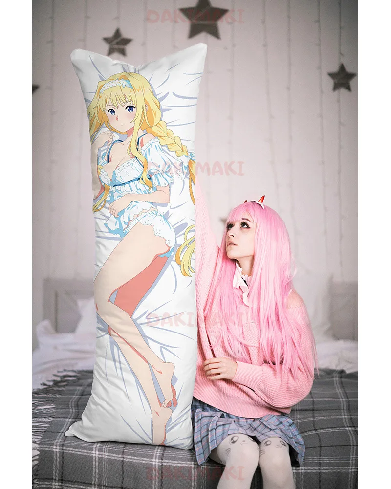 • наволочка + подушка + сумкаВыбрать необходимую комплектацию вы можете в свойстве "Цвет". Описание наволочки. Наволочка для дакимакуры Алиса Цуберг | Alice Zuberg и Асуна Юки | Asuna Yuuki – персонажа аниме-сериала Мастера меча онлайн | Sword Art Online размером 150 на 50 см шьется на собственной фабрике в Москве. Ткань: атлас высокой плотности 160 гр/м2, обладает умеренно глянцевым оттенком. Швы прочные с использованием оверлока. По короткой стороне наволочки имеется потайная молния. Двусторонняя печать на наволочке выполняется методом сублимации, что обеспечивает высокую четкость и цветоустойчивость принта. Мы даем гарантию стойкости принта к окрашиванию на 90 циклов стирок. Описание подушки. Информация о подушке для наволочки дакимакуры. Подушка плотно набита холлофайбером - гипоаллергенным наполнителем, сочетающим мягкость и упругость. Вес составляет около 2,7 кг. Если подушка покажется слишком объемной, в напернике предусмотрен доступ к наполнителю через потайную молнию, которая позволяет легко регулировать плотность подушки. Поставляются подушки для дакимакуры в вакуумной упаковке.