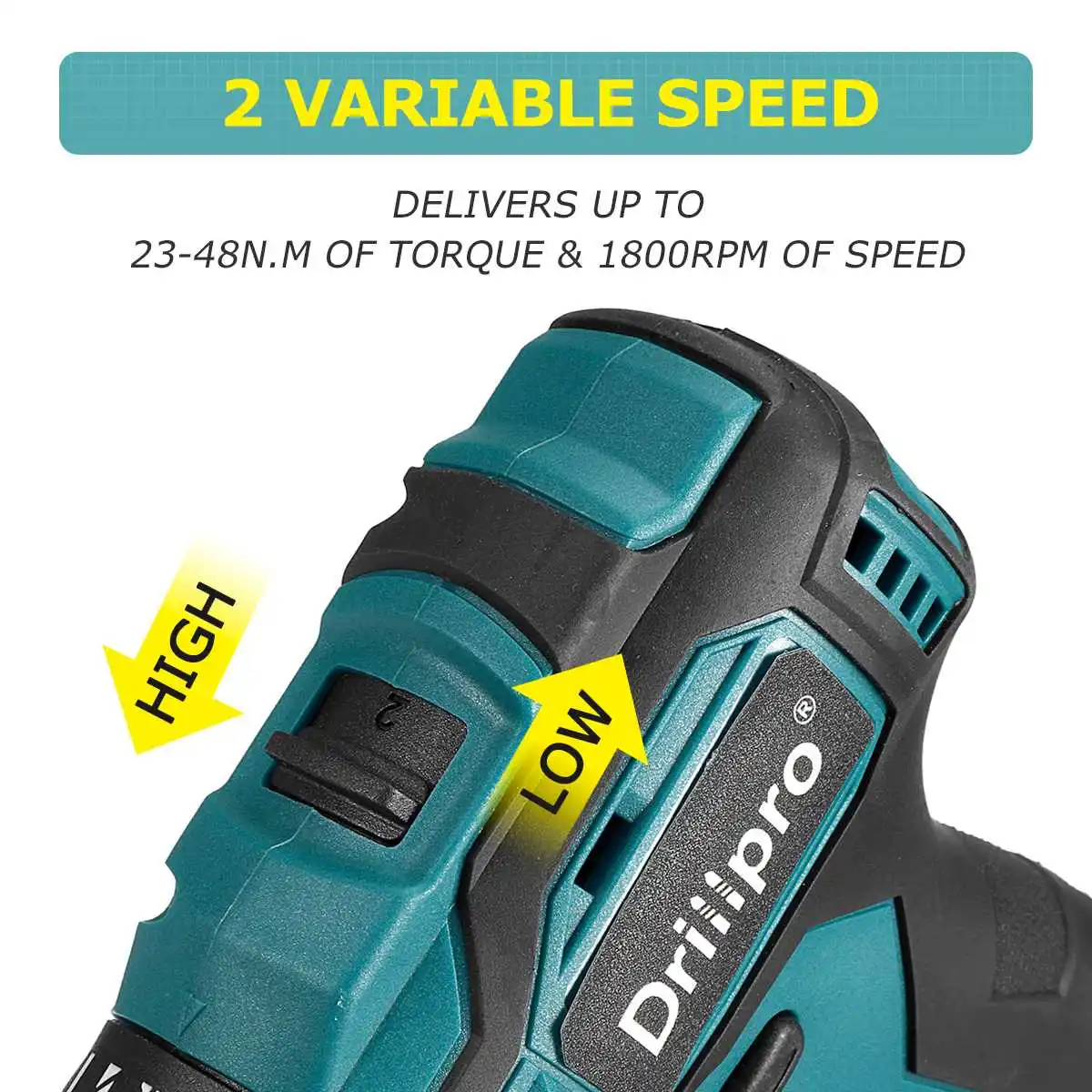 Особенности-Мощный бесщеточный двигатель обеспечивает до 23-48N.m крутящего момента и 1800 об/мин скорости.-20 + 3 настройки выбора крутящего момента обеспечивают наиболее подходящую силу сверления и точное управление для сверления в древесину, металл, пластик и все задачи отвертки.-2 настройки Переменной скорости для плавного завинчивания на низкой скорости и быстрого сверления на высокой скорости.-Функции вперед и назад позволяют Винтам управлять или откручивать с удобством.-Светодиодный светильник повышает видимость рабочей зоны, мягкая ручка уменьшает усталость во время использования.-Беспроводная Дрель имеет компактный легкий дизайн, избавьтесь от проблем с поиском гнезда для зарядки проводным сверлом.